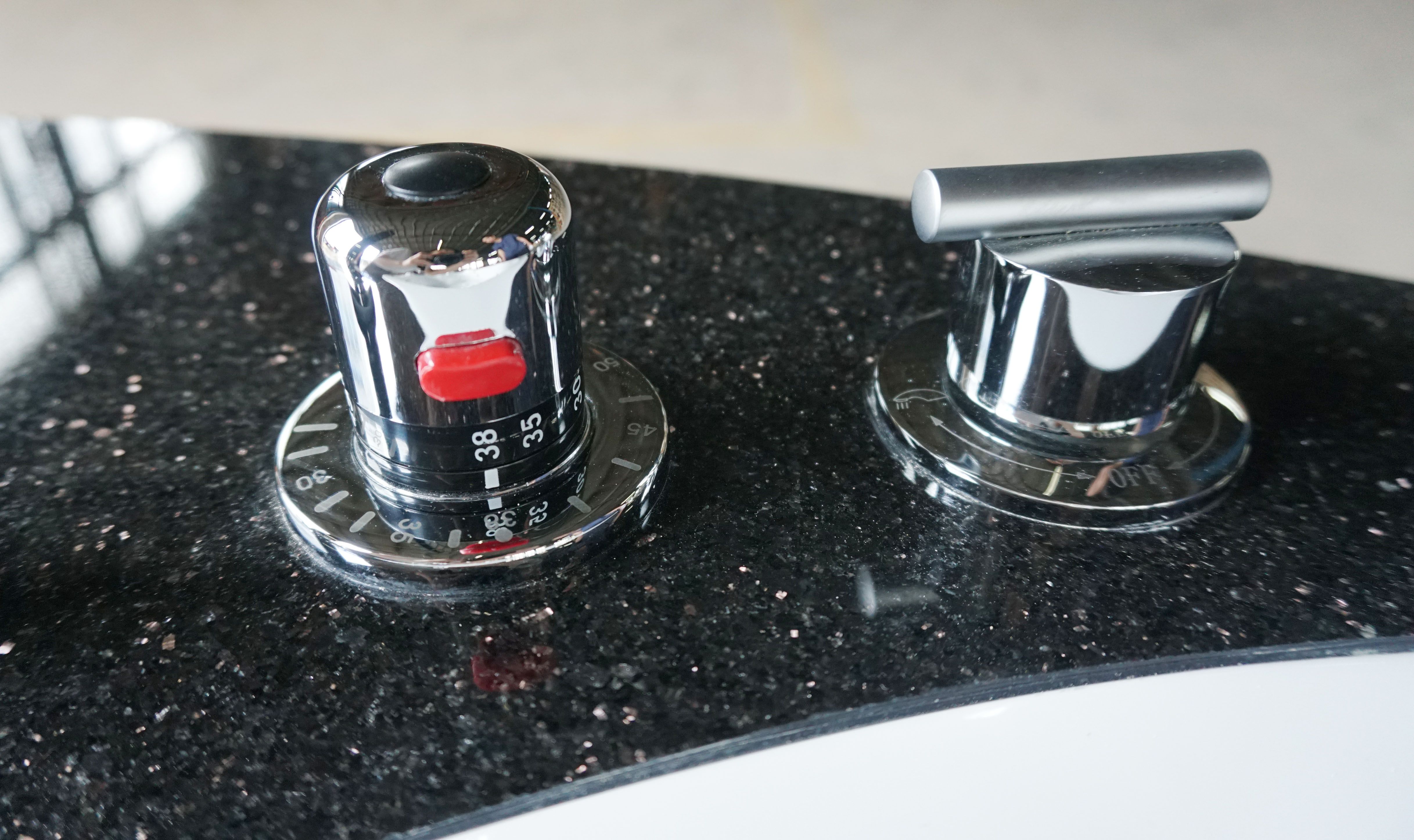 - Thermostatic valve with anti scalding max temperature of 100' f. FM radio, bluetooth, and speakers built in. Chromotherapy LED Lighting: colors change automatically or manually.