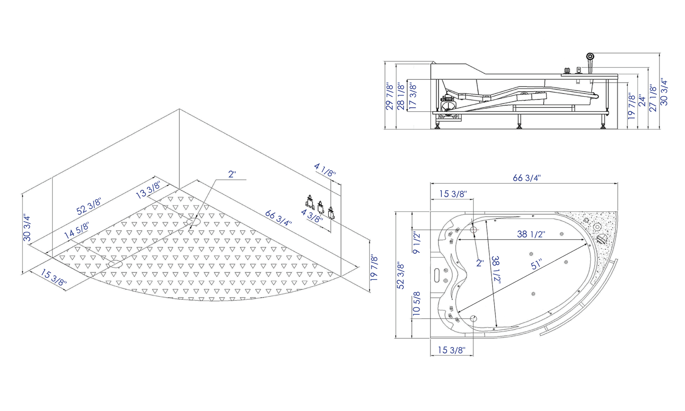 A: Dimensions: 66.75" L x 52.4" W x 28.13" H; Water capacity: 111 gallons.