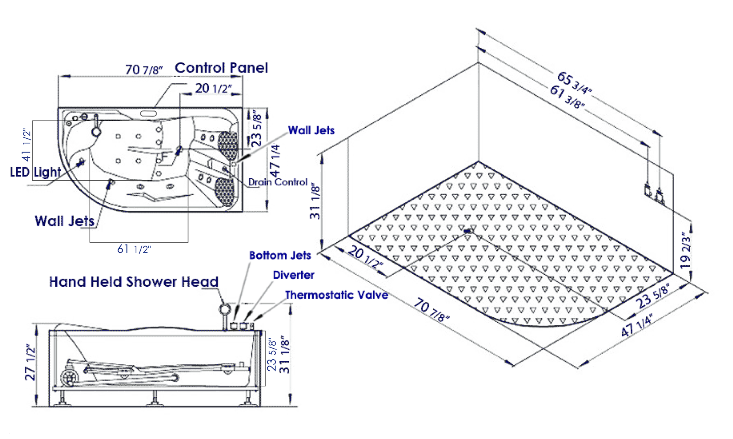 - Keypad Control Panel: Operates the bathtubs whirlpool jets, inline heater, digital sound system, and chromotherapy lighting and includes child lock.