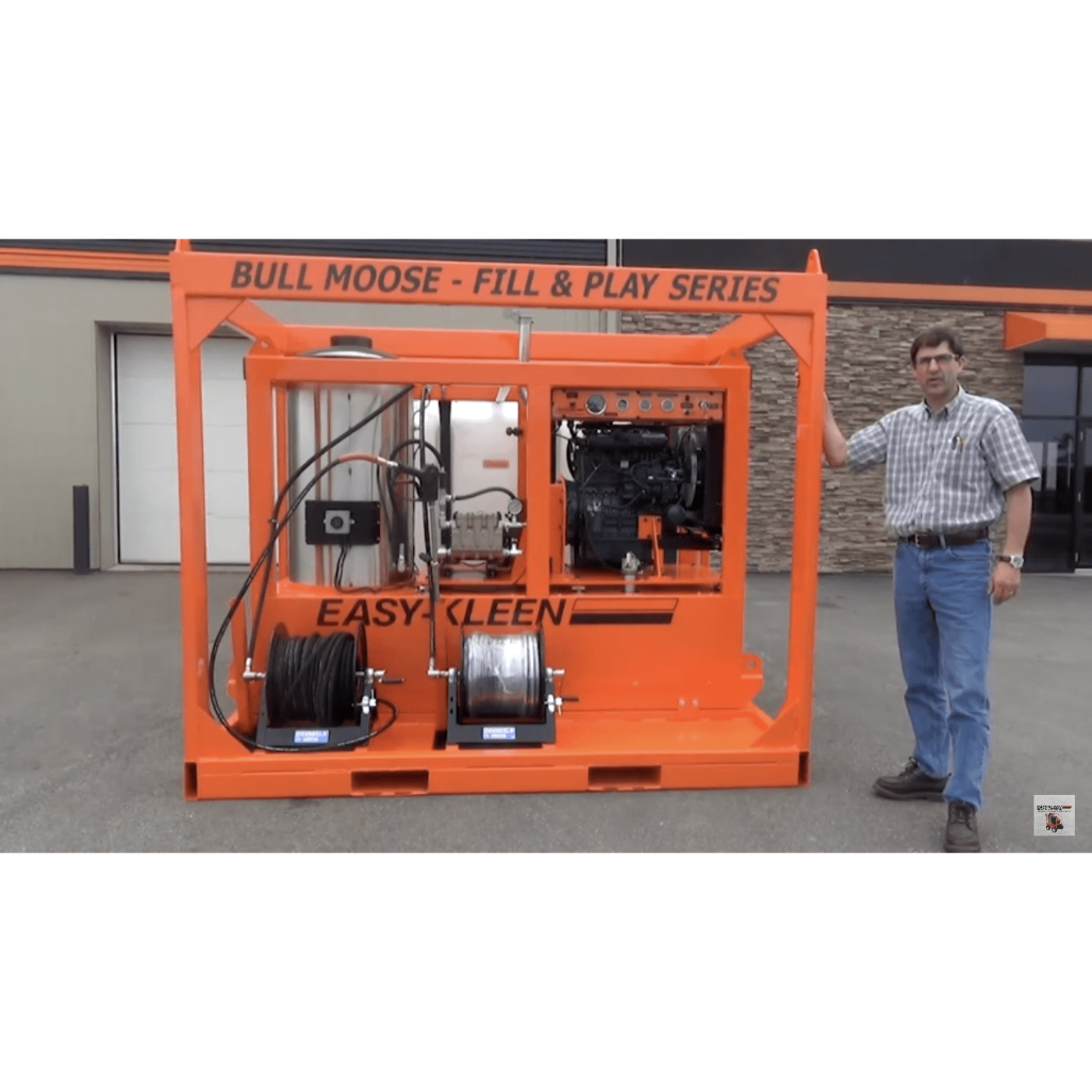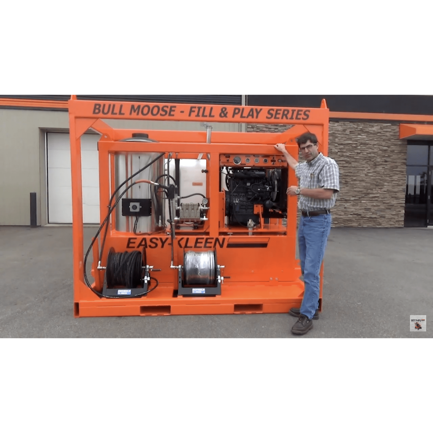 A: The EZO3508D is a truck-mounted industrial hot water pressure washer from Easy-Kleen's Bull Moose Series. It delivers 3500 PSI at 8 GPM, powered by a 26 HP Kohler diesel engine, ideal for extreme-duty cleaning in remote or mobile applications.