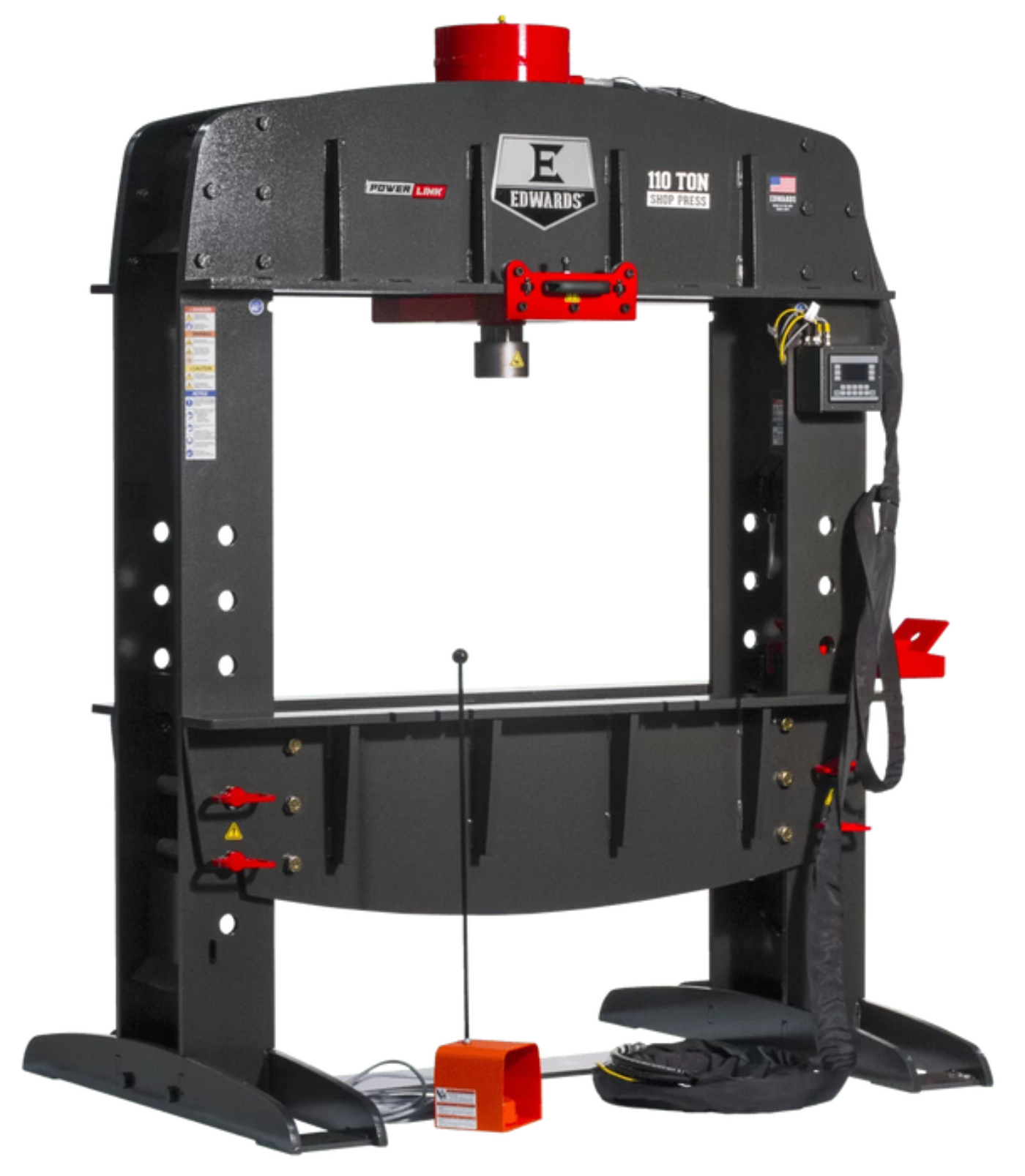 Our most powerful Shop Press, this 110 Ton Shop Press includes a Programmable Logic Control (PLC) to maximize your efficiency with shorter cycle times - over a 50% time savings. With the greatest capacity this Shop Press is able to accept all of our standard tooling along with custom tooling in its large work table area, the 110 Ton can press bearings, bend metal or straighten your parts. The rolling cylinder, open-sided design, and electric foot pedal make this machine simple to use. Must be run off an Edwards Ironworker with PowerLink ™ System or Portable Power Unit