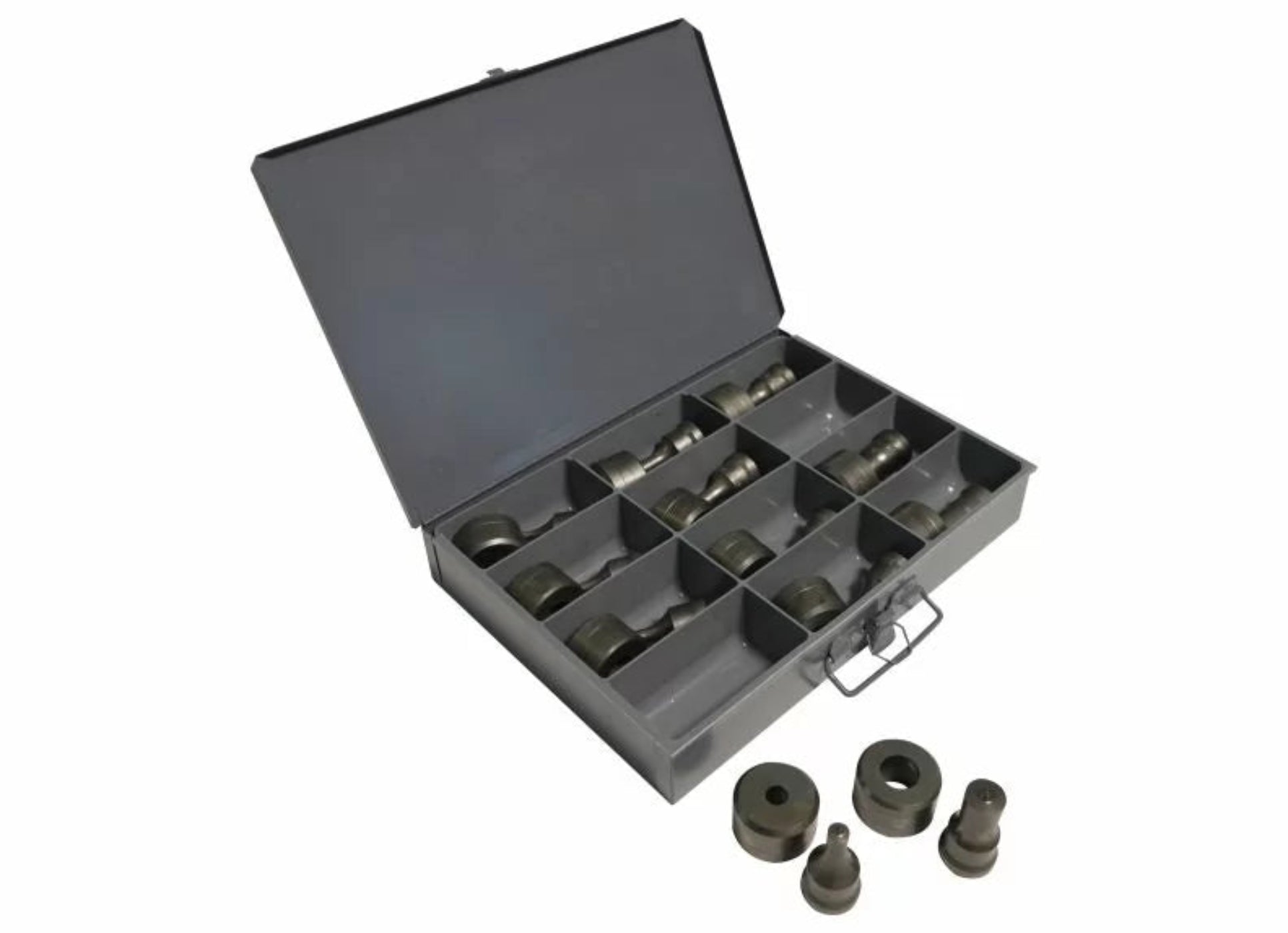 The EDWARDS 12 PC. Round Metric Punch & Die Set is a high-performance toolset designed for precision die-cutting in a variety of materials including metal, leather, and plastics. This set includes 12 round punches and dies in metric sizes, ideal for professionals who require accuracy and durability in their cutting operations. The set is neatly housed in a durable Storage Case, ensuring each tool remains organized and protected. Perfect for use in metalworking, leatherworking, and industrial applications, this punch and die set ensures clean, consistent cuts with every use.