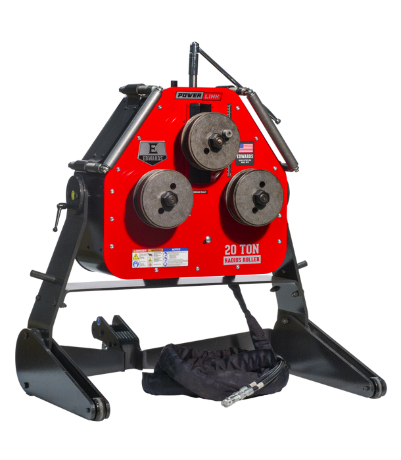 The Edwards 20 Ton Radius Roller is designed to roll medium to heavy flat bar, angle, pipe, tube and channel in smooth, long diameter bends. Able to operate either Horizontally or Vertically depending on your project and with a heavy-duty rolling base, you can move the Radius Roller out of the way when your project is complete. Must be run off an Edwards Ironworker with PowerLink System or Portable Power Unit.