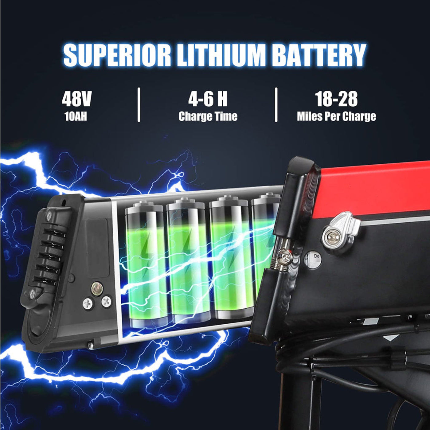 Battery and Range: Features a 48V 10.4Ah removable lithium-ion battery, offering a range of 50-70 miles per charge, depending on road conditions and rider weight.