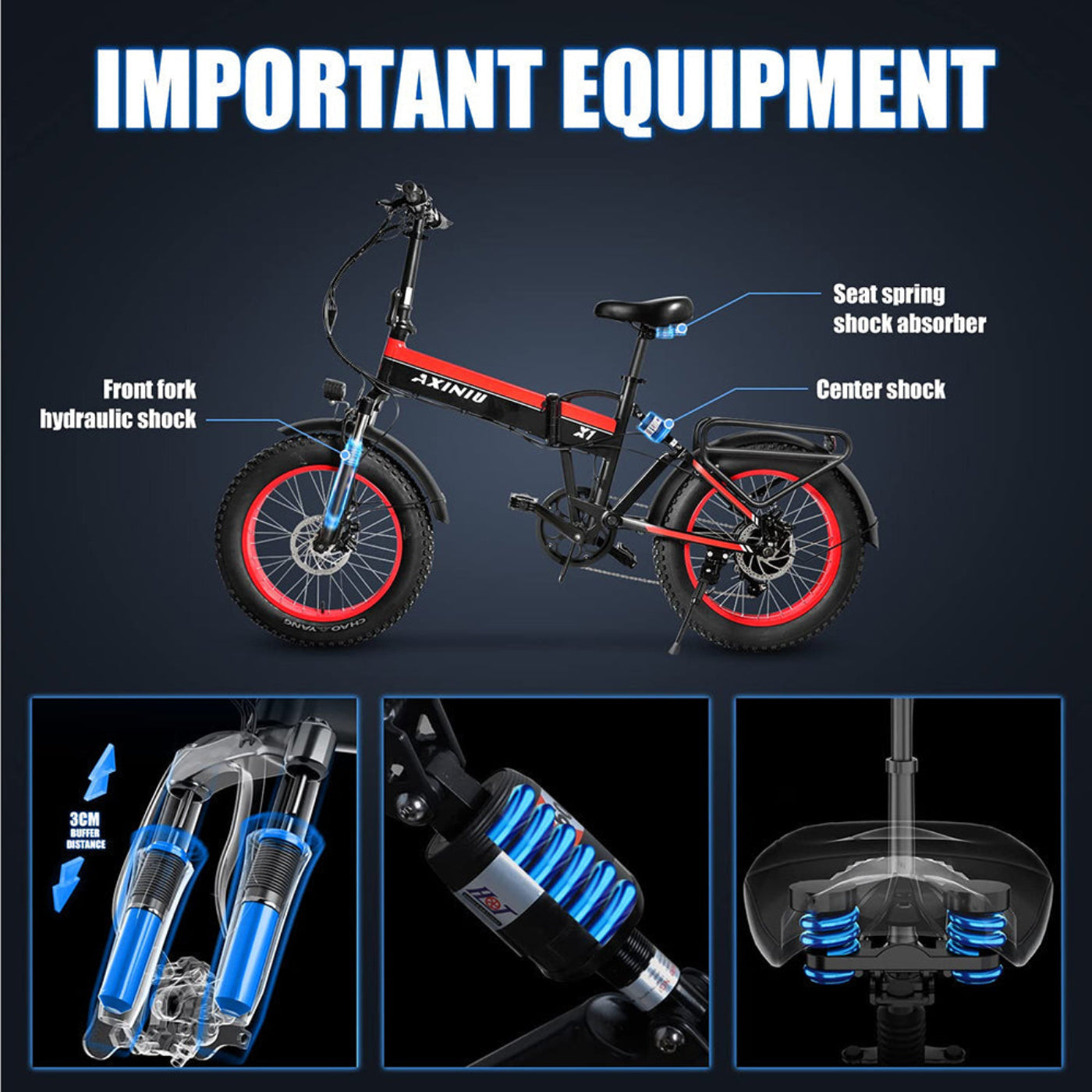 Fat Tires: Comes with 20" x 4.0" fat tires, offering enhanced stability and traction, making it suitable for beach, mountain, and snow terrains.