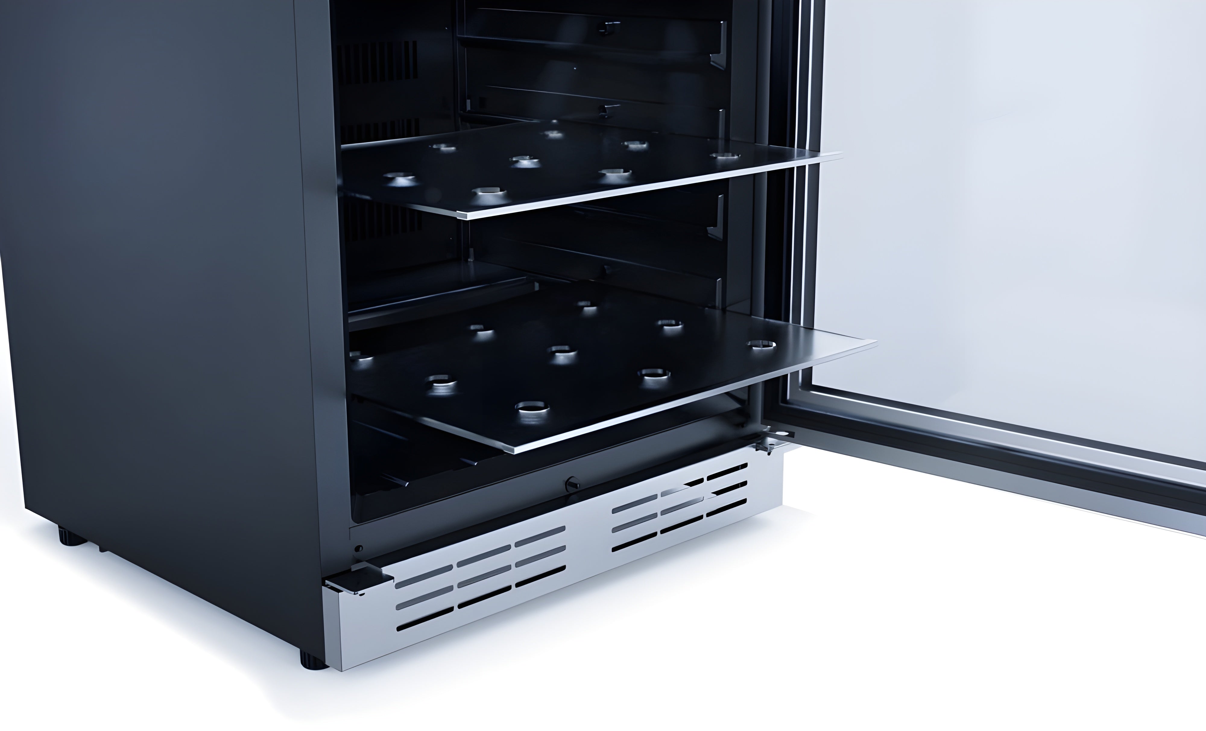 Single door, single zone: RISERVA - EBS51SS1 creates the dream conditions for your favorite seltzer drinks. This 24” undercabinet refrigerator has the capacity to fit up to 100 cans (12oz). Featuring 3 adjustable slide out Plexiglass shelves, 304 Stainless Steel frame with double layered UV resistant glass door and an exclusive concealed hinge design that delivers a more refined appear and tighter fit within cabinetry.