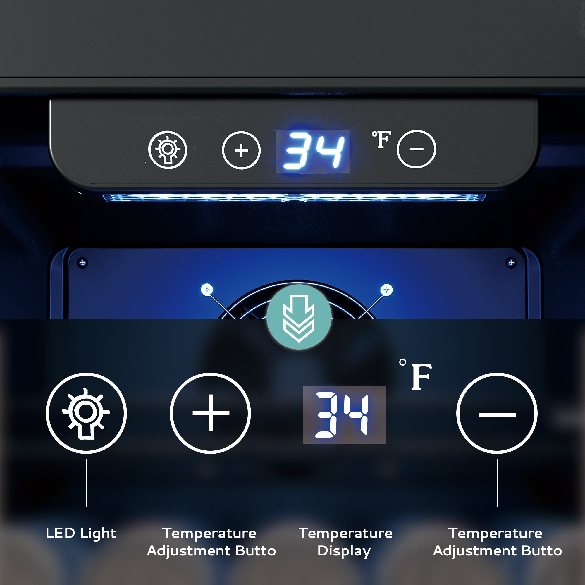 - One-touch operation & LED light :With an adjustable temperature range of 36-61°F (2-16°C), this beverage fridge offers easy one-touch settings at the touch of a button on the LCD display, providing perfect refrigeration at all times. The mini fridge built-in soft blue ambient LED lights keep your beverages in a classy environment and can help you select your favorite drinks in a dark setting.