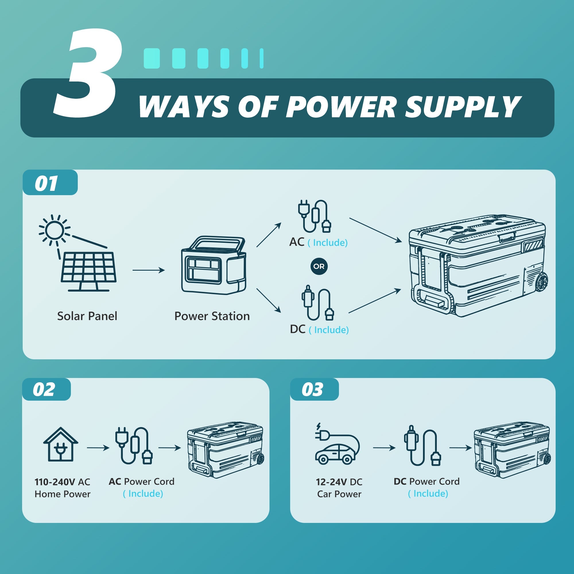 - Battery Protection & Multiple Power Supply Methods The car fridge freezer has an intelligent three-level battery protection function, and the input power can be adjusted from 9.6V to 12.4V in L/M/H mode to prevent overload or the car battery exhaustion. Battery protection allows you don't have to worry about battery power, suitable for cars, SUVs, trucks, garage and boats. Car fridge can be powered by 12/24V DC/100-240V AC line, to meet your needs in a variety of scenarios