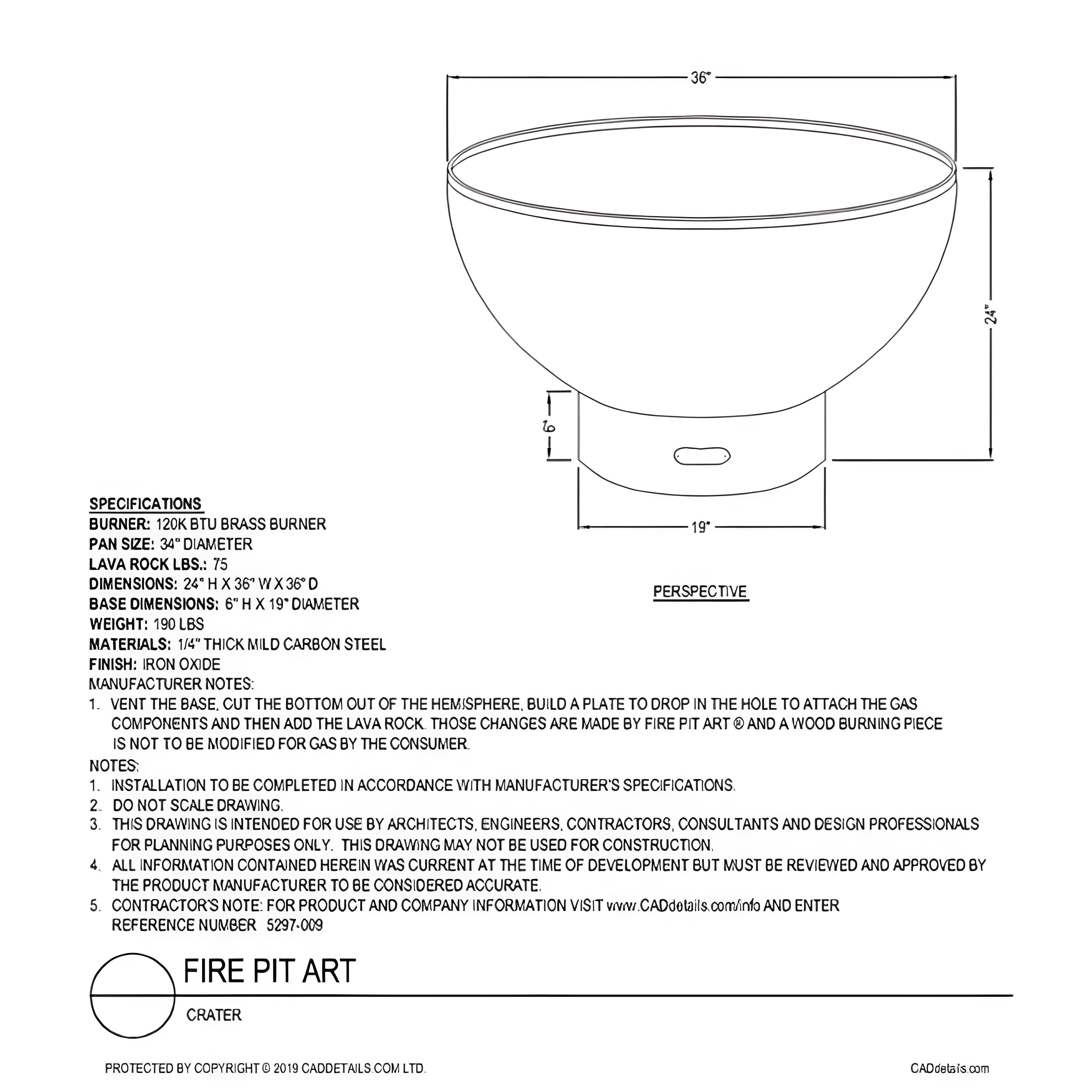 The Fire Pit Art Crater is a classic, yet modern fire pit design that will add a warm ambiance to your backyard. The bowl-shaped carbon steel frame weighs 190 pounds and has an impressive 120 thousand BTUs output! It's made from 1/4" thick mild carbon steel that makes it durable enough for any weather conditions you might face in the fall or wintertime. This particular bowl fire pit is 24" H x 36" W x 36" in Depth. The fire pit's patina will darken over time and remain permanent, thanks to its durable outer layer.