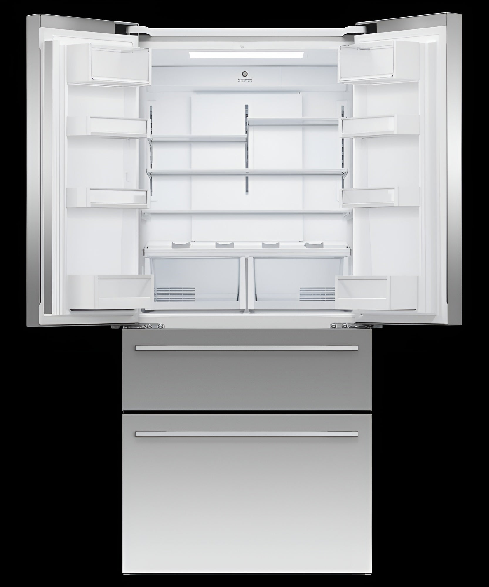 A: It has a French door design with a bottom freezer for easy access to fresh and frozen foods.