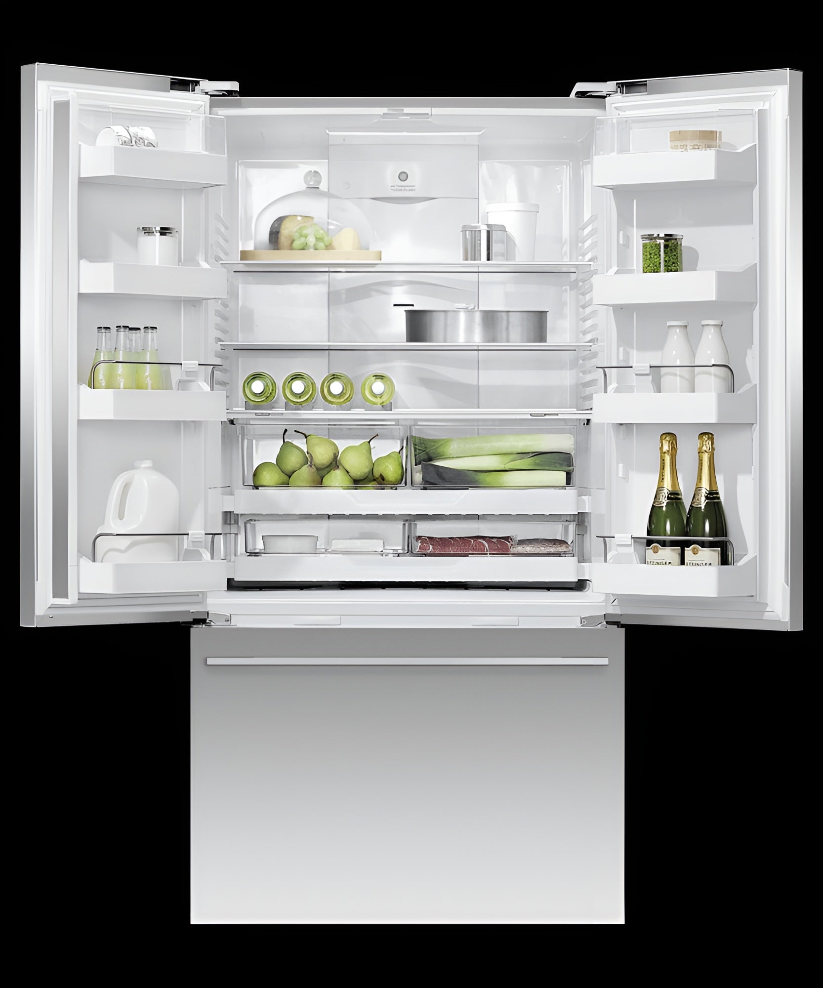 A: It has a French door design with a bottom freezer for convenient access to fresh and frozen foods.