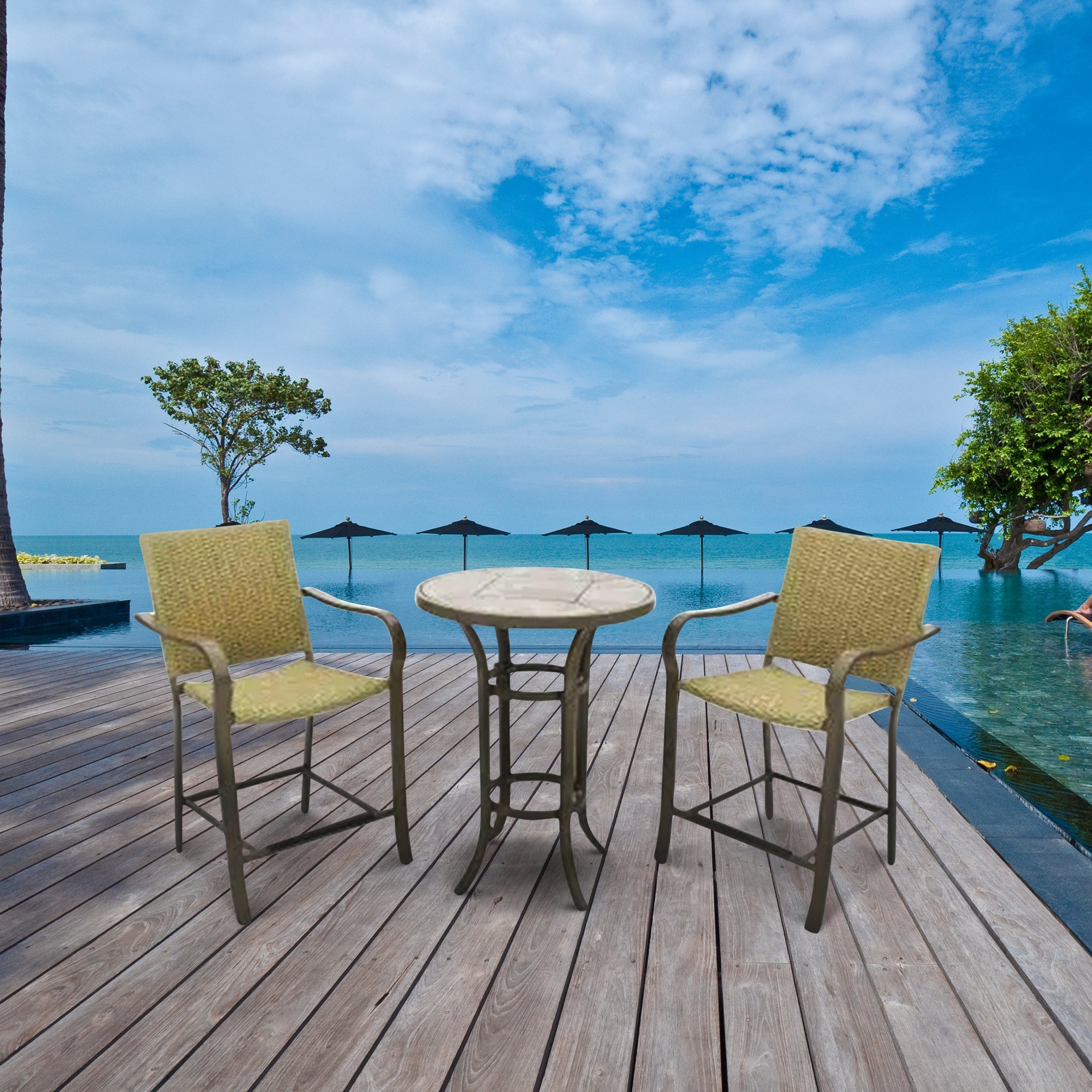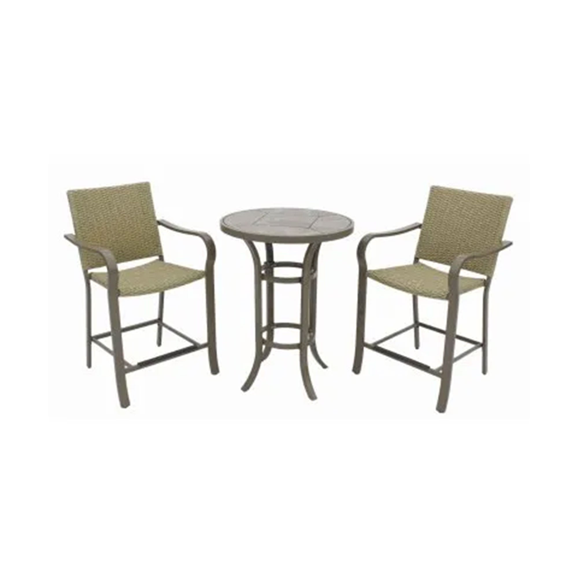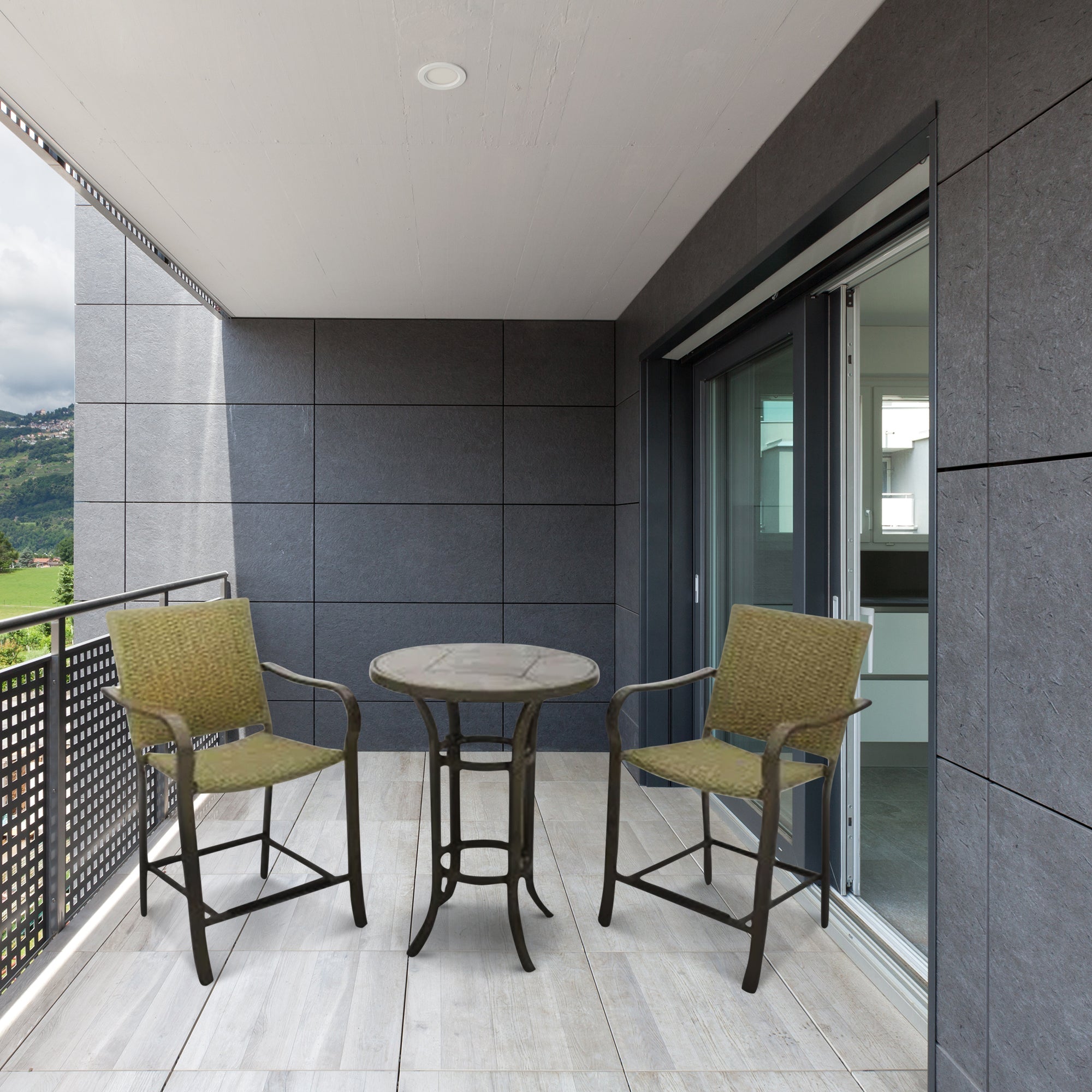 Gather around the captivating 28-inch decorative tile balcony-height table, transforming your outdoor space into a haven for conversations and gatherings. This patio furniture seamlessly blends style and durability with a mixed-media woven technique and powder-coated steel frames. With a weight capacity of 250 pounds, it ensures a sturdy dining experience. The chairs, with a comfortable 25-inch seat height, create an inviting atmosphere for any outdoor occasion, making this 3-piece set a great addition to your patio or balcony.