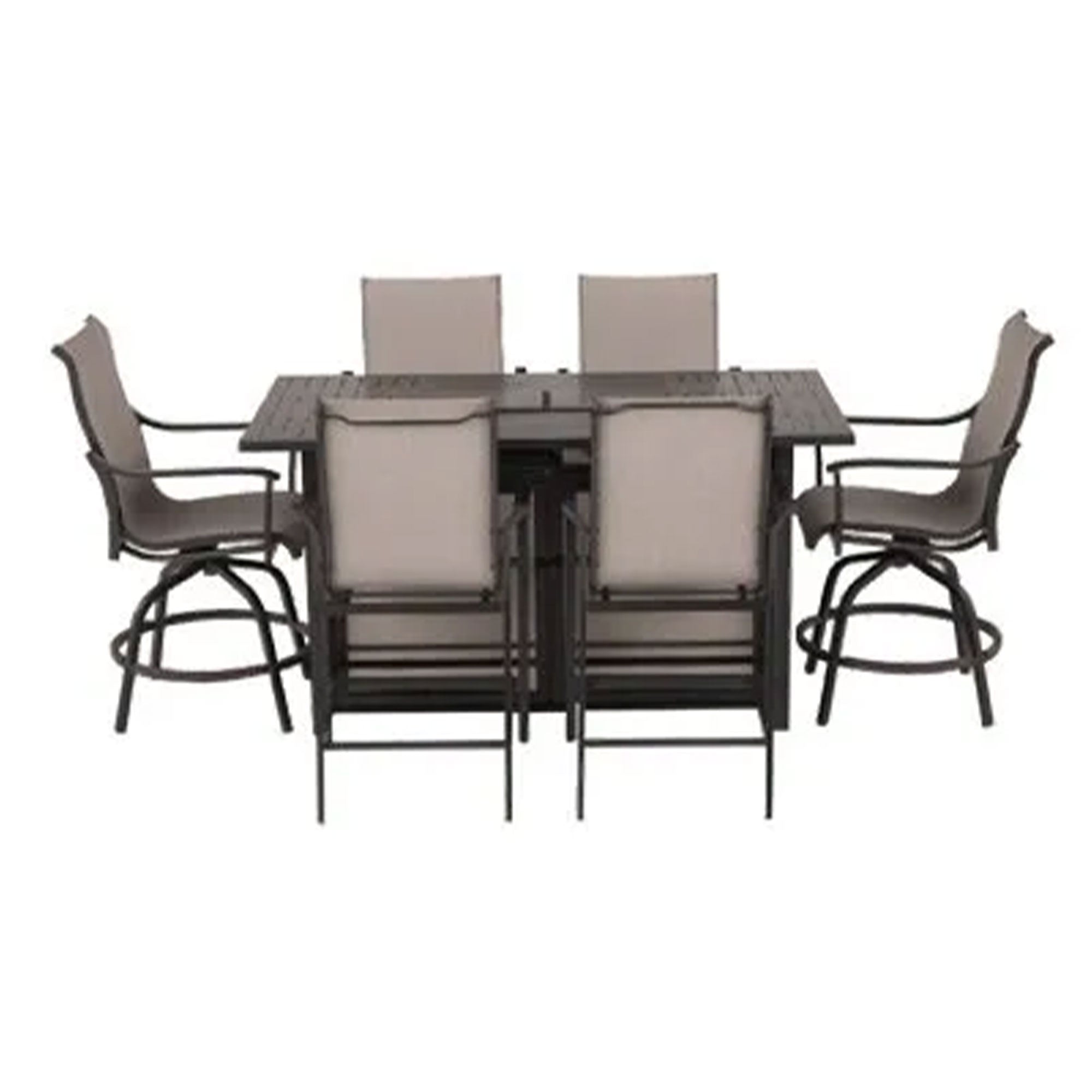 Transform your outdoor dining experience with the Four Seasons Courtyard Manhattan 6-Piece High Chair Dining Set.