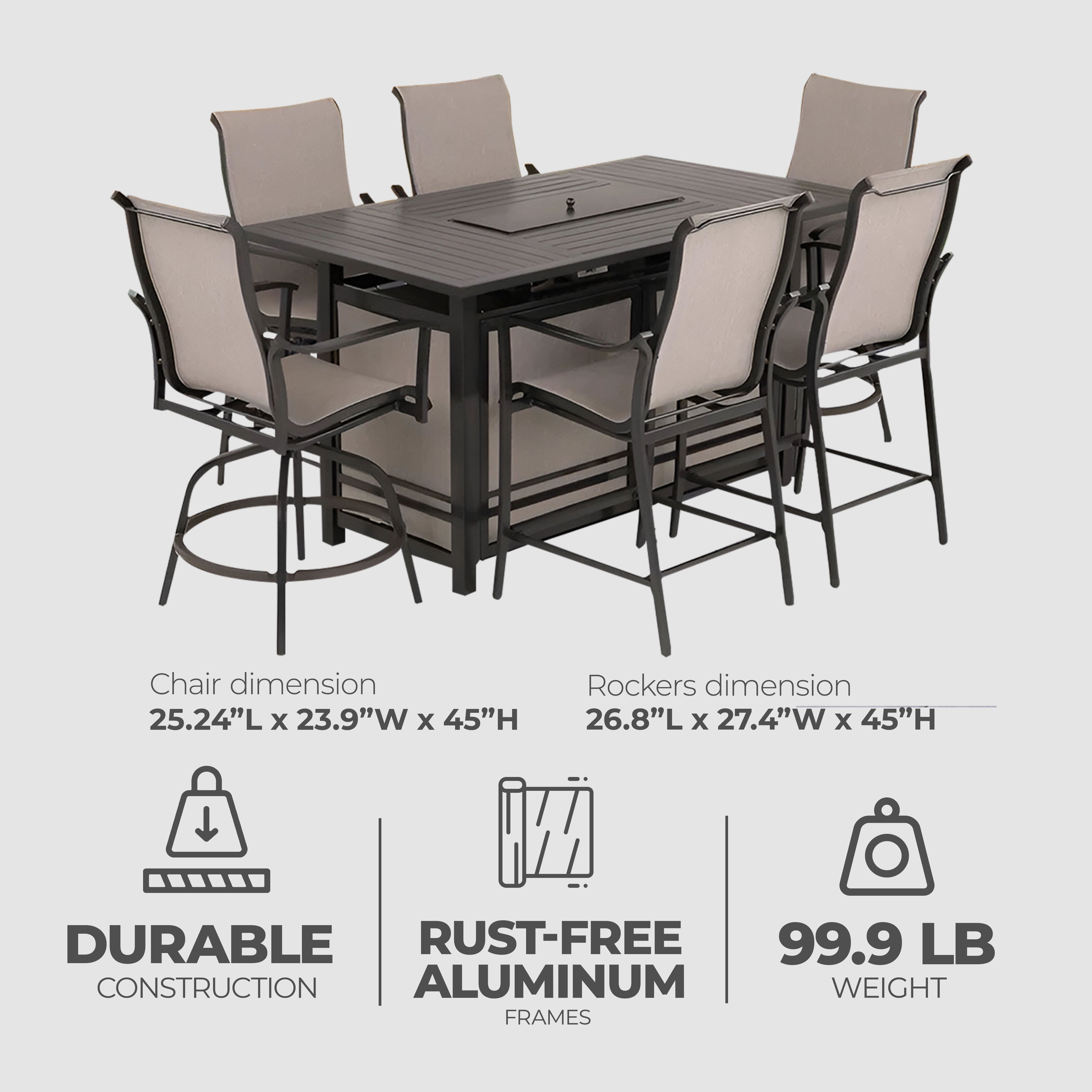 Each piece in this high dining chair set is built to withstand the elements, making it a resilient addition to your outdoor furniture collection. With a weight capacity of 250 pounds, these chairs and rockers offer both sturdiness and comfort for your guests to relax and enjoy outdoor meals or gatherings. For added warmth and ambiance, consider pairing this exquisite chair set with the matching gas firepit, available separately. Create an inviting atmosphere as you gather around the flickering flames, making your outdoor space the perfect setting for memorable moments.