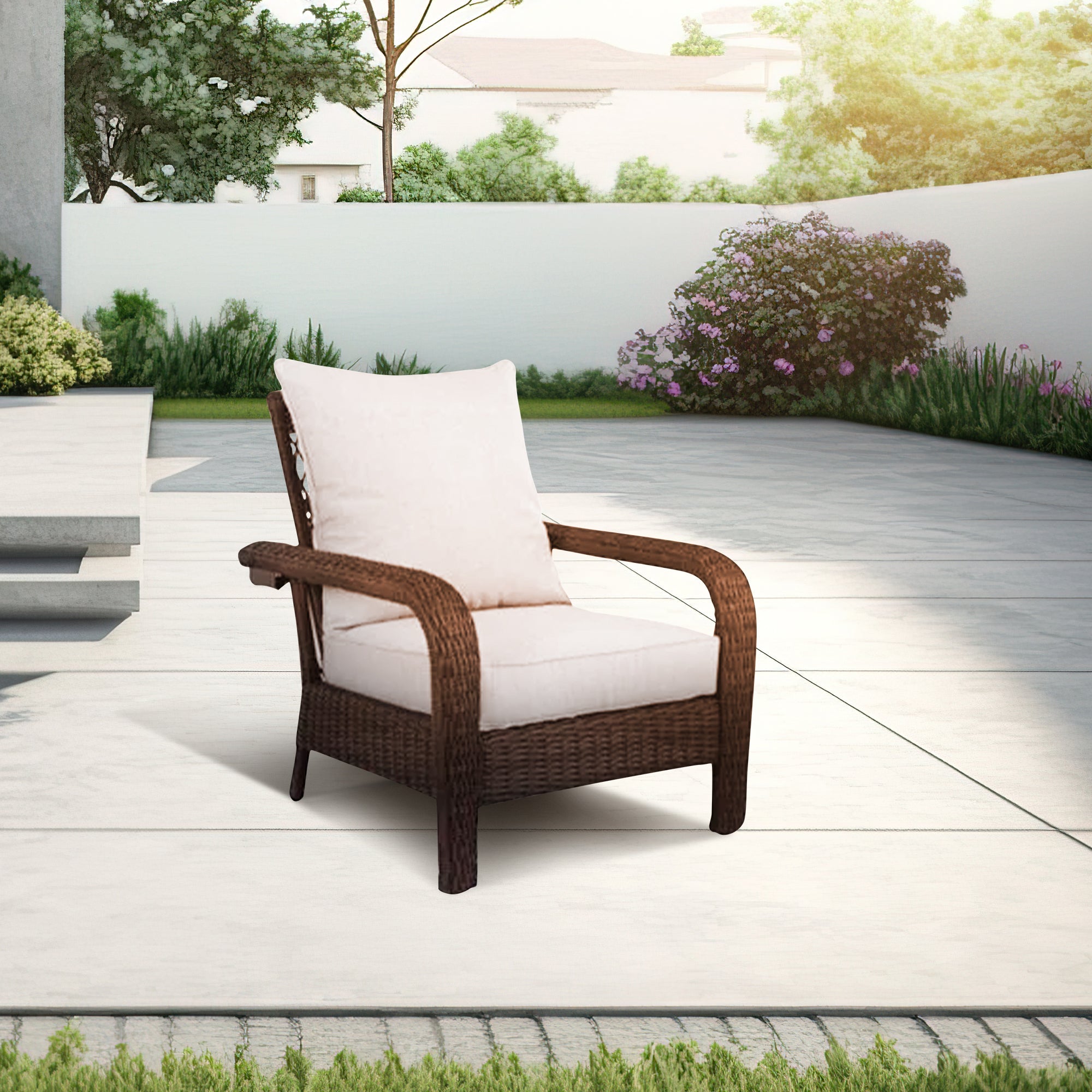 Crafted with a robust steel strap seat complemented by elegant ivory olefin cushions, these chairs deliver an opulent seating experience. Their all-weather design guarantees durability, making them ideal for outdoor settings. The brown wicker appearance adds a touch of refinement to your patio or garden, fostering a warm and inviting ambiance. Beyond their stylish appeal, the Montego Bay Chairs are engineered for enduring performance that instills confidence in their quality. Constructed with a balanced mix of materials, they strike the ideal equilibrium between strength and comfort. Each chair's dimensions, measuring 35.43 inches in length, 32.28 inches in width, and 36.22 inches in height, offer ample space for relaxation. With a robust weight capacity of 250 pounds, these chairs ensure sturdiness suitable for various body types. While assembly is required, the resulting comfort and aesthetic enhancement make the effort well worthwhile.