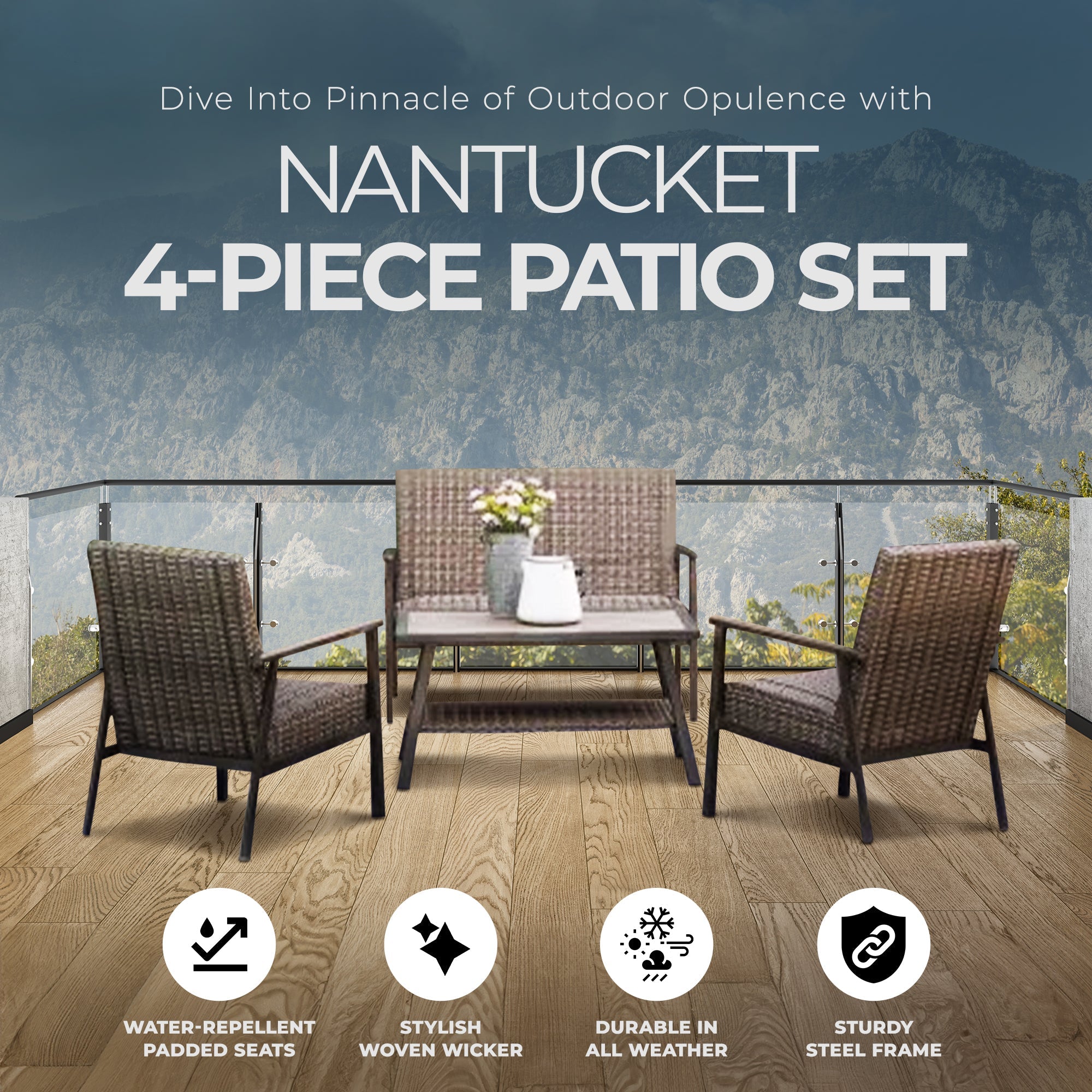 All-Weather Durability: The Four Seasons Courtyard Nantucket 4-Piece All Weather Deep Seating Patio Set is built with durable all-weather woven wicker and a strong steel frame, ensuring long-lasting performance against various outdoor elements.
