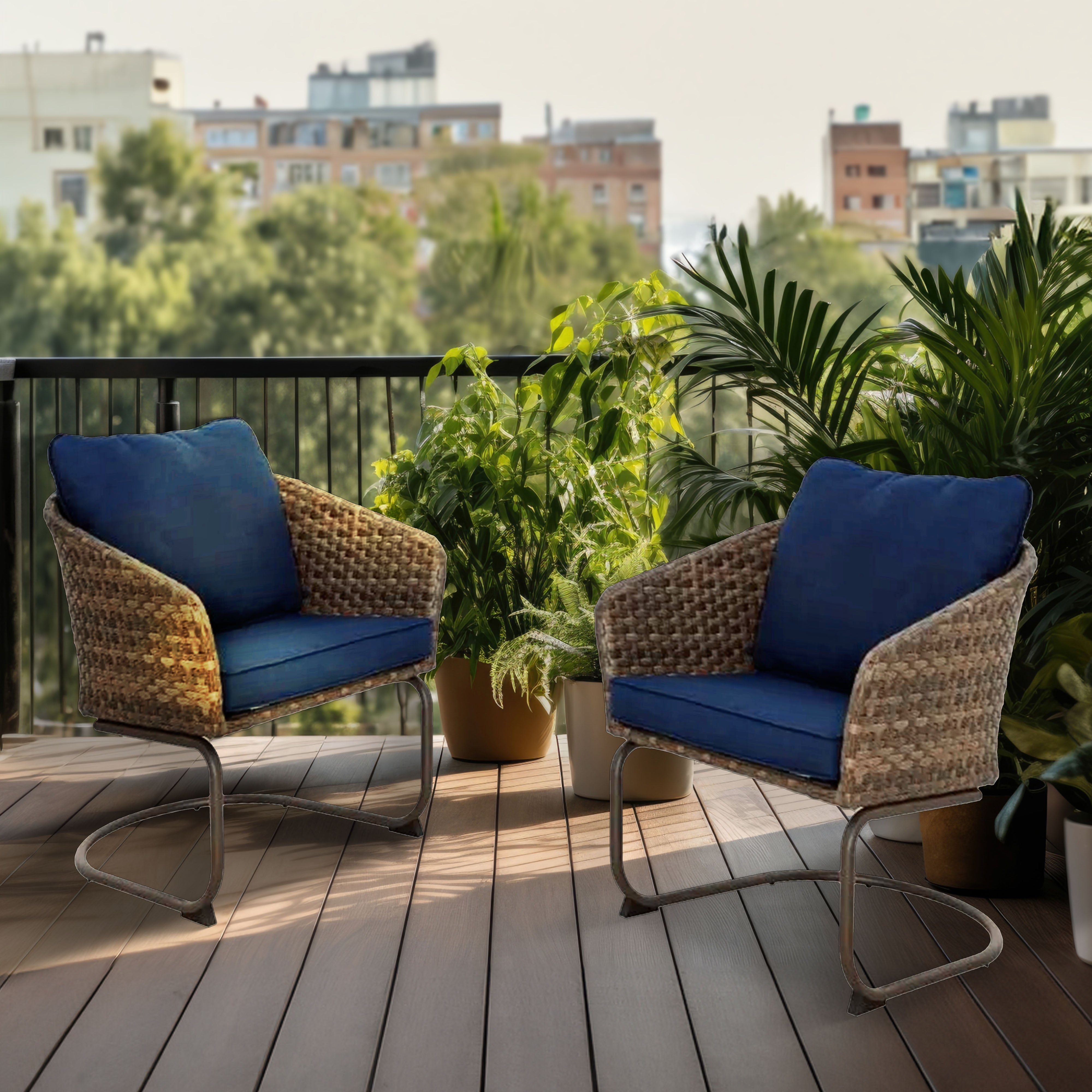 Crafted with precision, these chairs effortlessly blend modern style and comfort. The handwoven, all-weather variegated brown wicker cord not only adds durability but also brings a touch of sophistication. The carefully selected navy blue Olefin cushions resist fading, and provide a plush seating experience. The stylish frame, made of robust powder-coated steel, ensures longevity and stability. Measuring 26.57 by 28.4 by 31.3 inches, these chairs offer ample space for relaxation. Experience the gentle rocking motion that invites you to unwind and savor countless hours in your outdoor oasis. With a weight capacity of 250 pounds, these patio essentials are not only elegant but also reliable. The composition of steel (60 percent), PE wicker (25 percent), olefin (10 percent), and polyester (5 percent) showcases a commitment to quality materials.