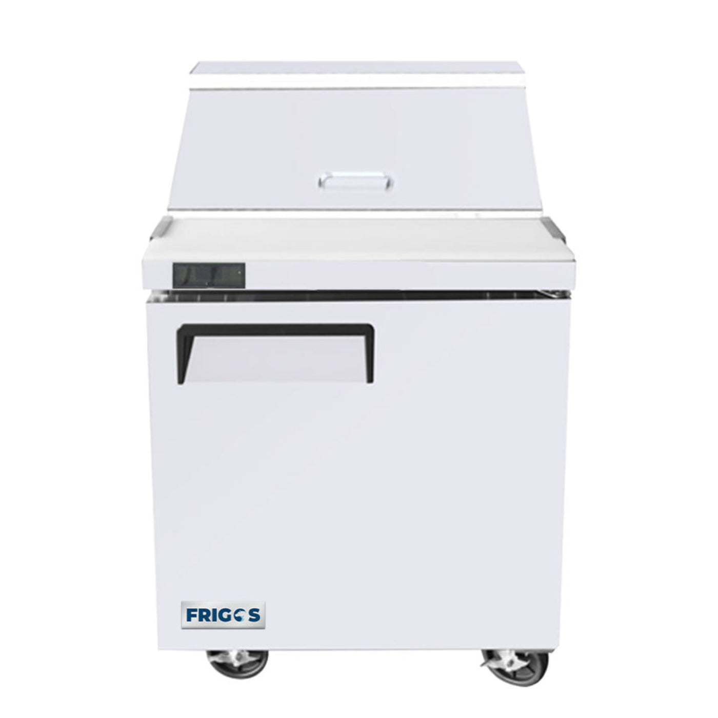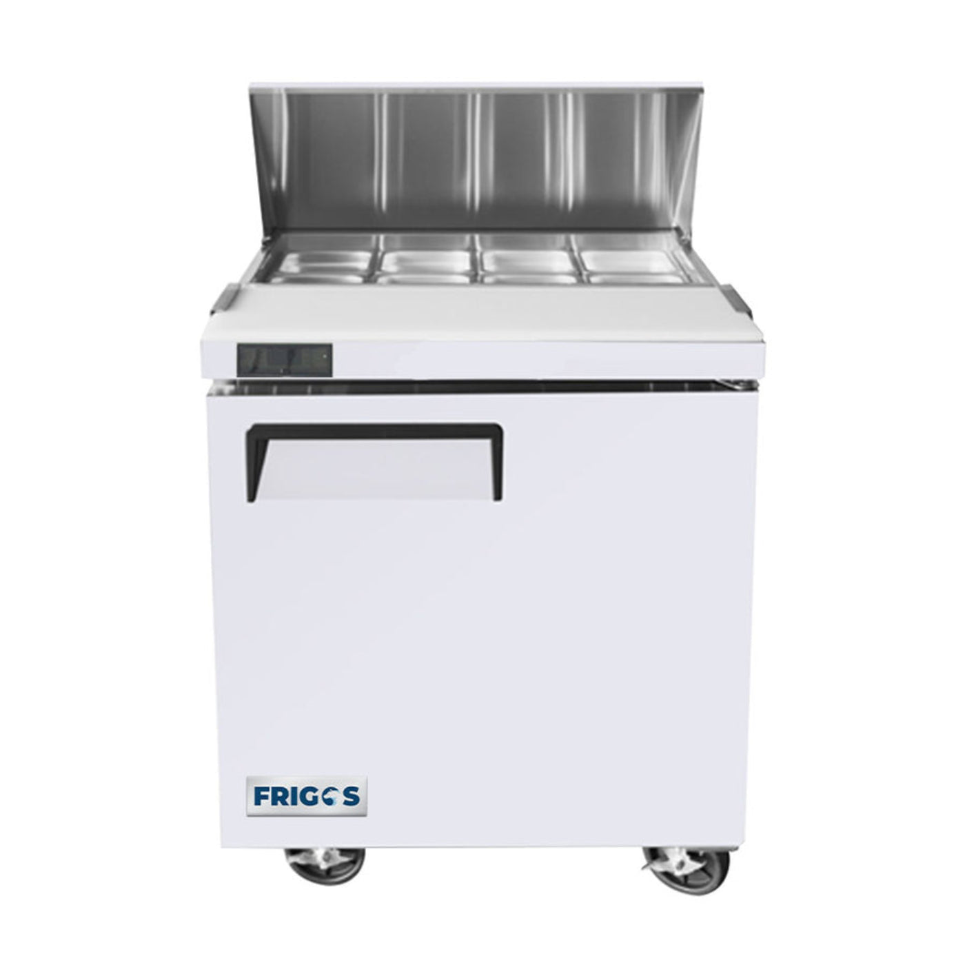 The Frigos FGA-SPT-8P-28 27" One Door Refrigerated Sandwich Prep Table is designed for efficient food storage and preparation. Equipped with a rear mount compressor and environmentally friendly R290 refrigerant, it maintains a temperature range of 35°F – 38°F, ensuring ingredients stay fresh. The unit’s concentrated airflow system guarantees even temperature distribution around the 8 pre-installed 1/6 size pans.
