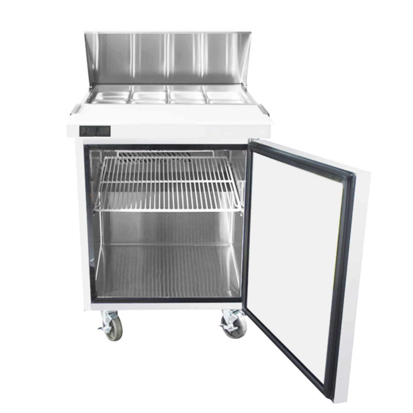 A: It’s a 27-inch commercial refrigerated sandwich prep table designed to efficiently store and organize sandwich ingredients in foodservice environments. It holds eight 1/6 size pans and features a solid door for easy access.