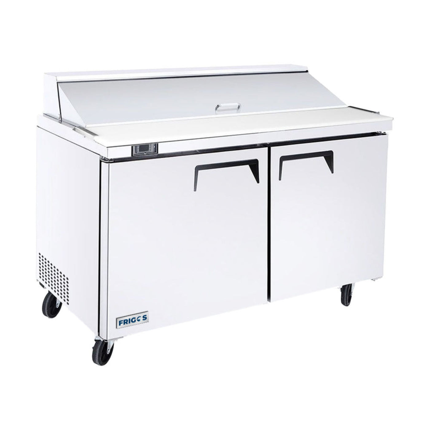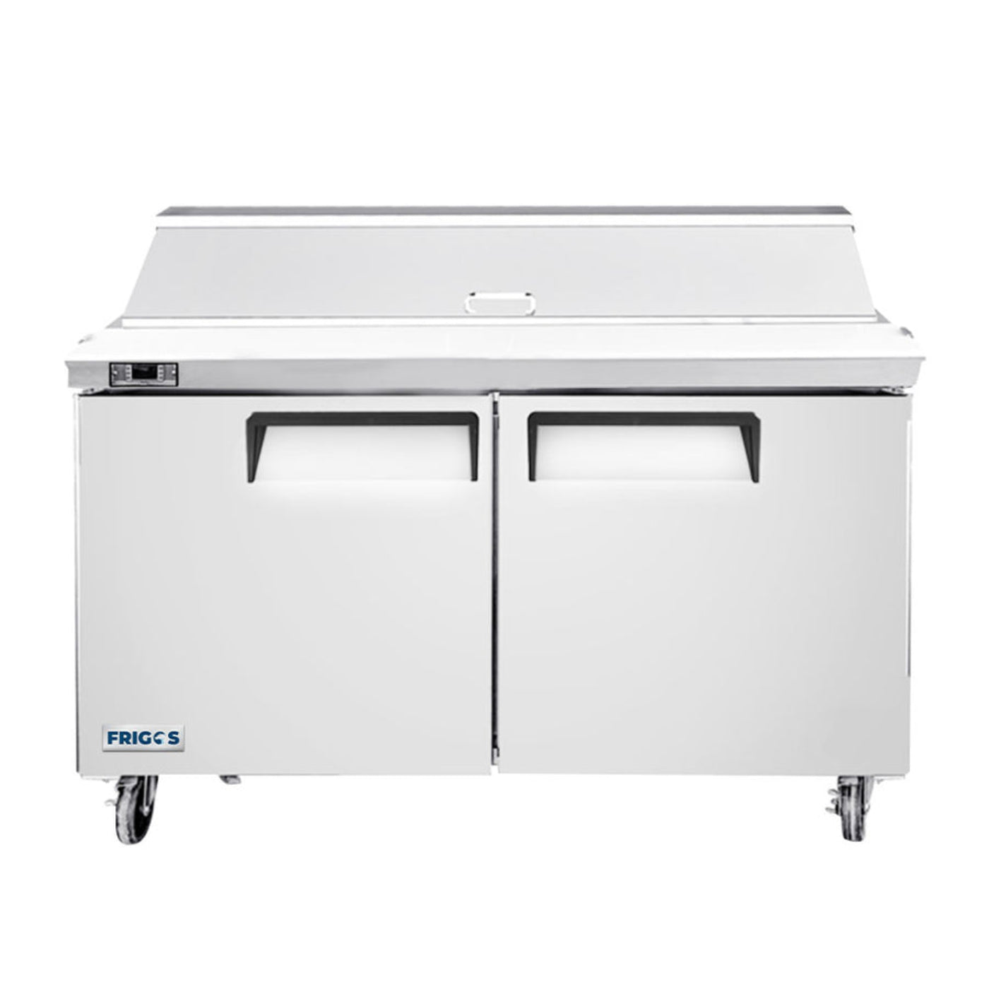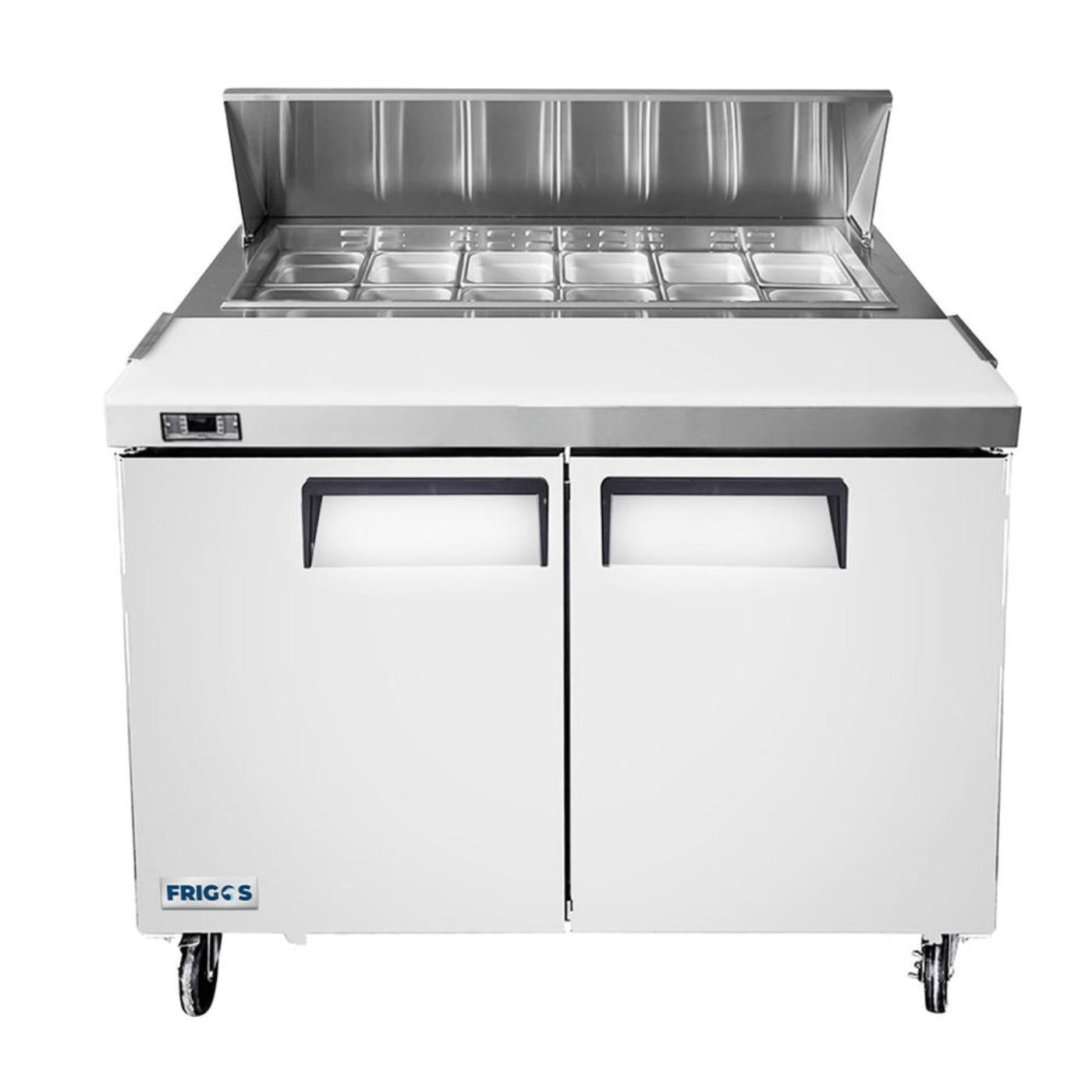 A: The Frigos FGA-SPT-12P-48 is a 48-inch commercial sandwich prep table designed for efficient cold storage and food preparation in commercial kitchens. It features two solid swing doors and accommodates twelve 1/6 size pans, making it ideal for sandwich and salad preparation.