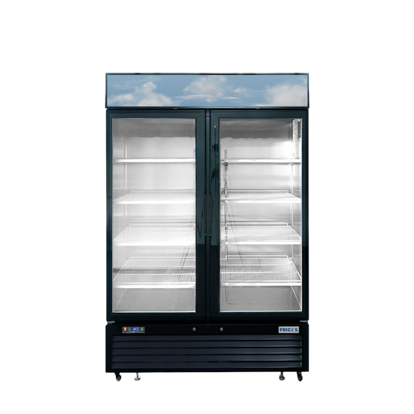 The Frigos FGA-MGDF-2D-54 54" Two Glass Door Freezer Merchandiser combines style and performance, making it a reliable choice for commercial settings. Its sleek black steel exterior, stainless steel interior, and spacious 44 cu. ft. capacity provide an attractive and durable solution for showcasing and storing frozen products.