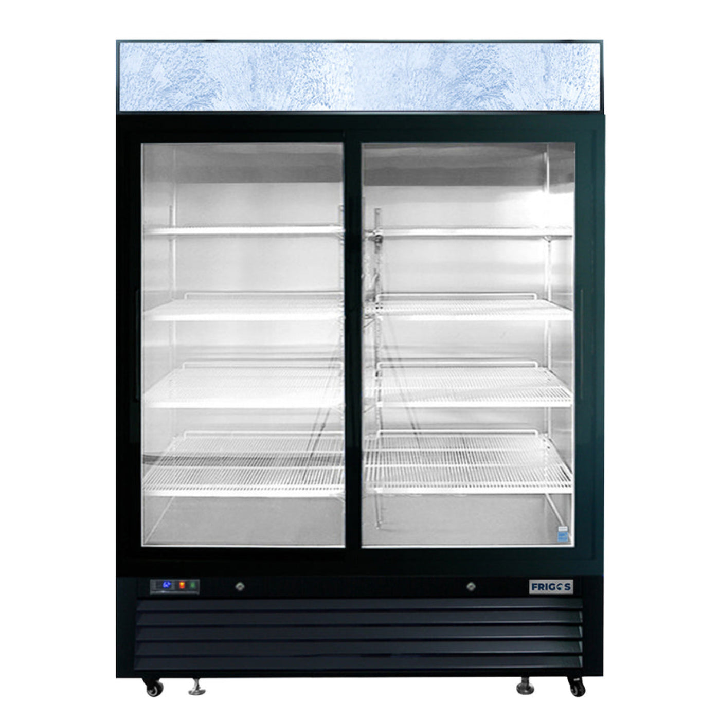 The Frigos FGA-MGDR-2SD-54 Merchandiser Refrigerator offers 45 cu. ft. of sleek and reliable storage with a black steel exterior and stainless steel interior. Designed to highlight your products, it features a lighted header panel, LED interior lighting, and double-pane sliding glass doors for maximum visibility and energy efficiency.