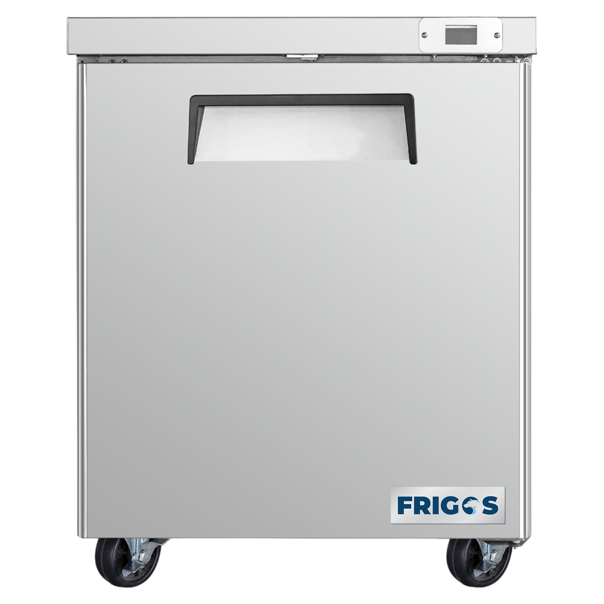 Introducing our top of the line one-door commercial undercounter refrigerator, model FG-UCRF-29, built to deliver exceptional performance and reliability for your commercial kitchen. This undercounter refrigerator offers a spacious interior, with precise measurements of 29 inches in width, 30 3/8 inches in depth, and 38 3/8 inches in height, providing ample storage with a capacity of 6.7 cubic feet, designed to accommodate all your refrigerated items.