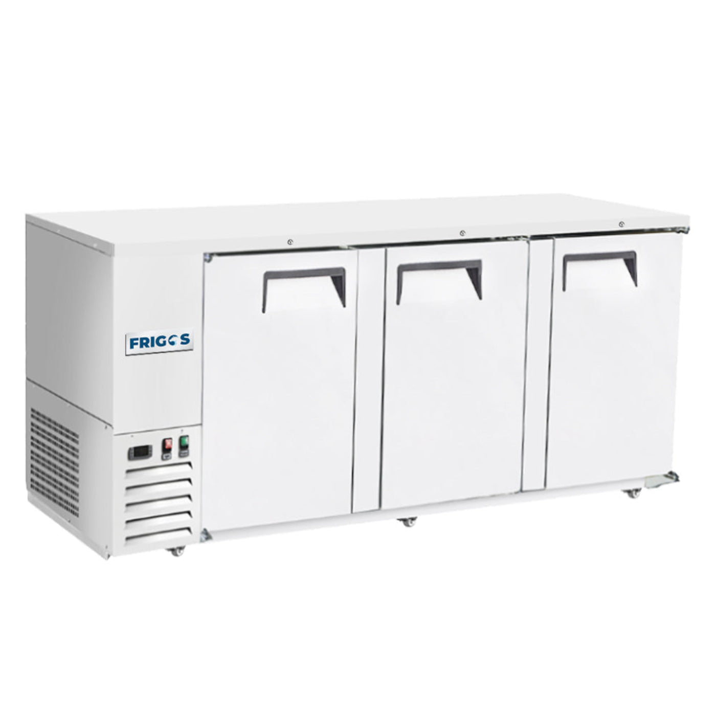 Frigos FGA-BBR-3D-90 89" Three Door Stainless Steel Back Bar Refrigerator is designed for high performance and durability. Featuring a stainless steel exterior and interior, it uses an electronic temperature controller to maintain optimal temperatures between 35°F and 38°F, ensuring your beverages stay chilled.