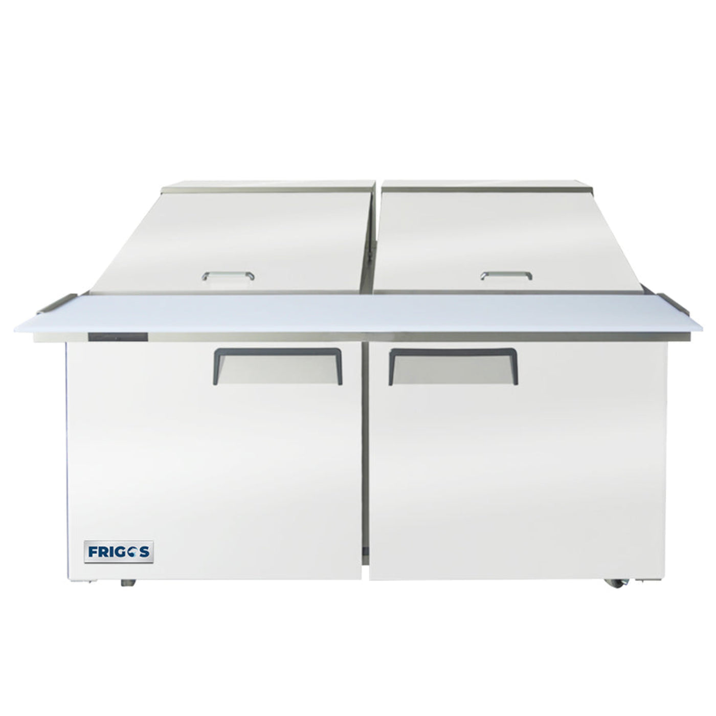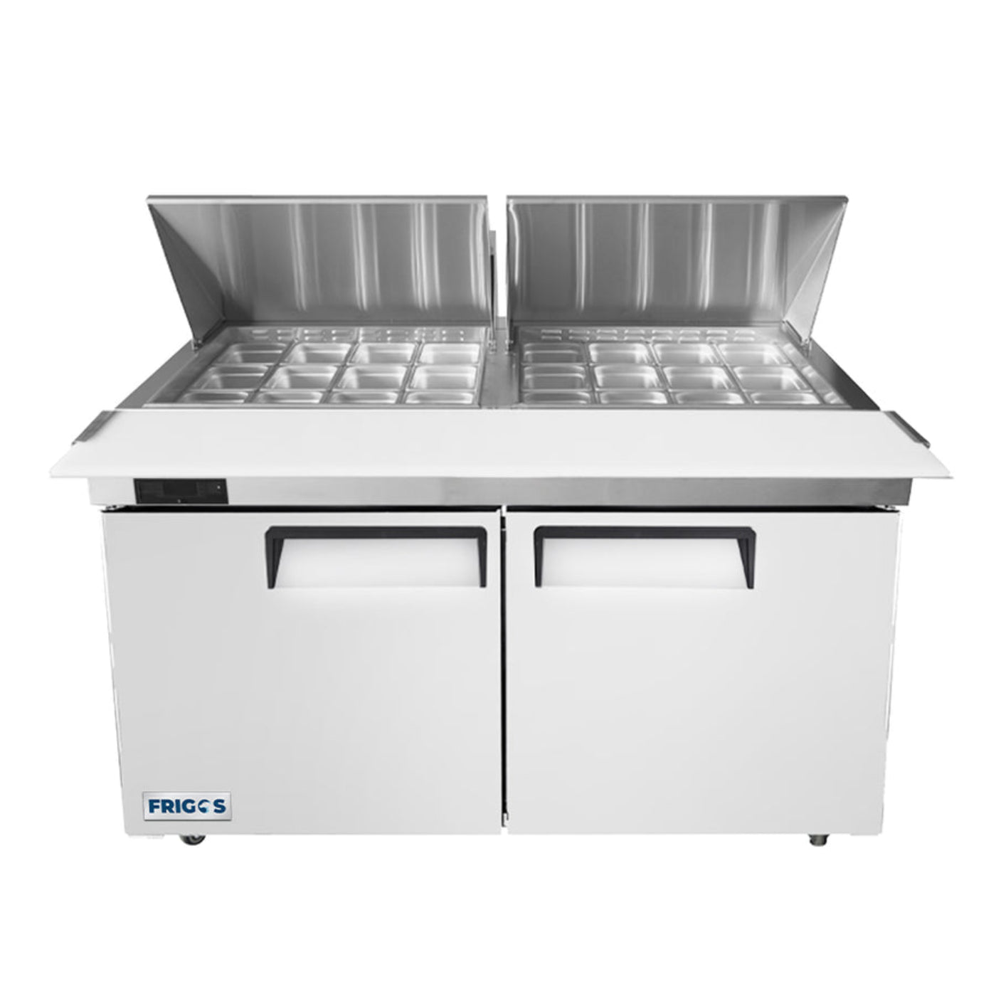 The Frigos FGA-SPT-24P-60-MT 60" Two Door Mega Top Refrigerator Sandwich Prep Table is designed for superior performance in fast-paced kitchens. Built with stainless steel inside and out, it features a rear mount compressor and eco-friendly R290 refrigerant to maintain temperatures between 35°F – 38°F. Its innovative airflow design ensures even cooling around the 24 pre-installed 1/6 size pans, keeping your ingredients fresh.