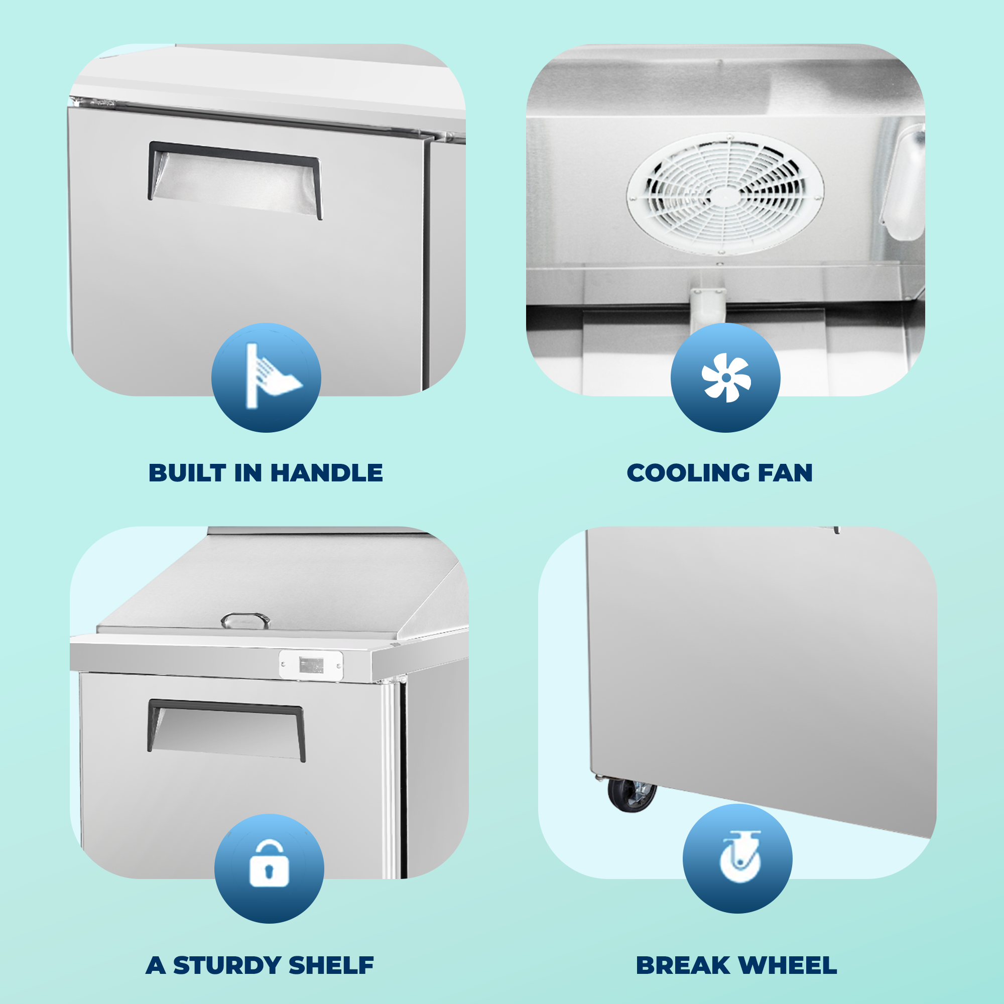 A: It’s a 29" single-door refrigerated prep table designed for sandwich and salad preparation, featuring an aluminum interior and 304 stainless steel floor for durability.