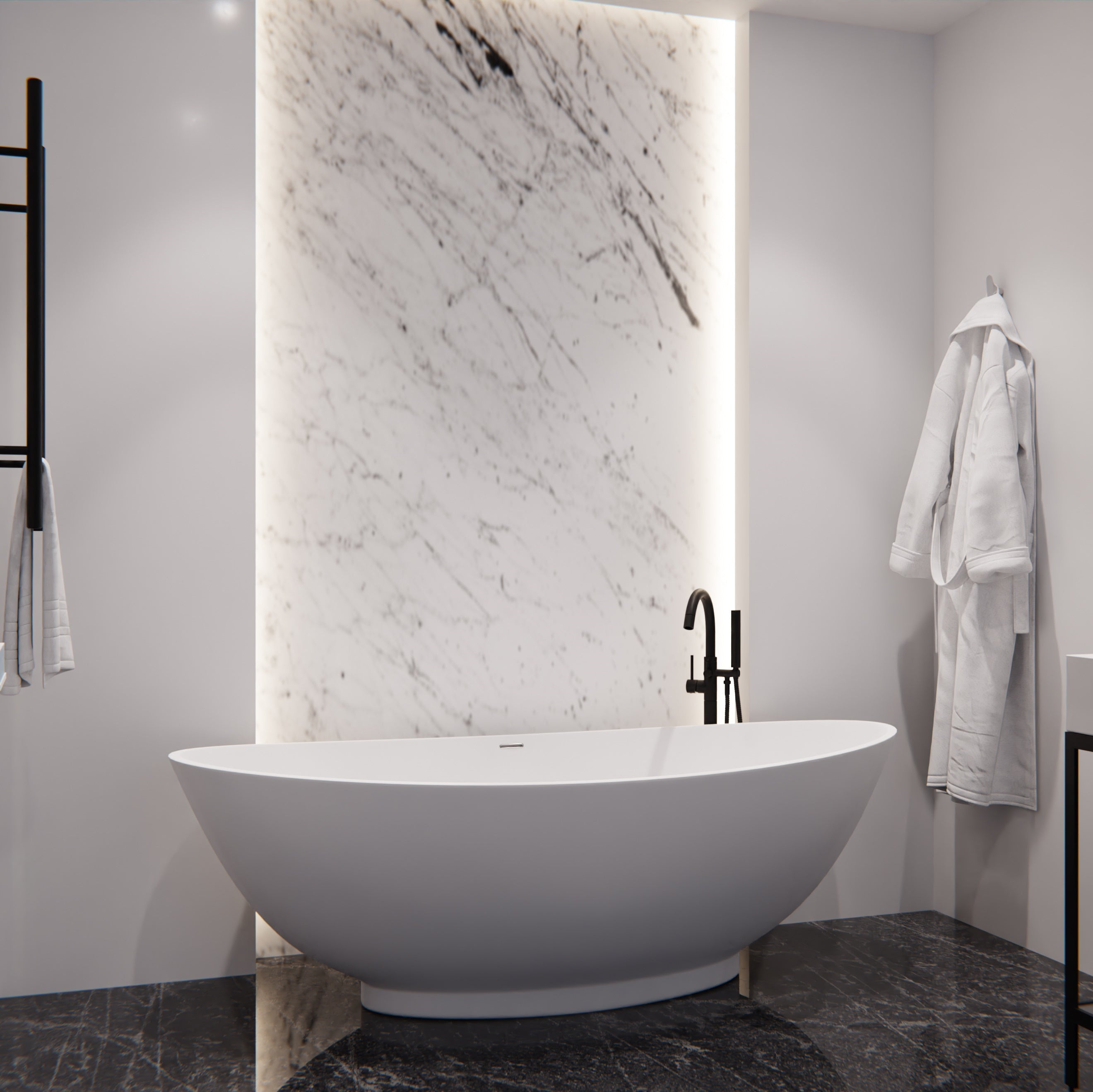 A: A luxurious solid surface freestanding bathtub with a center drain, designed for a modern, sleek look and a comfortable soaking experience.
