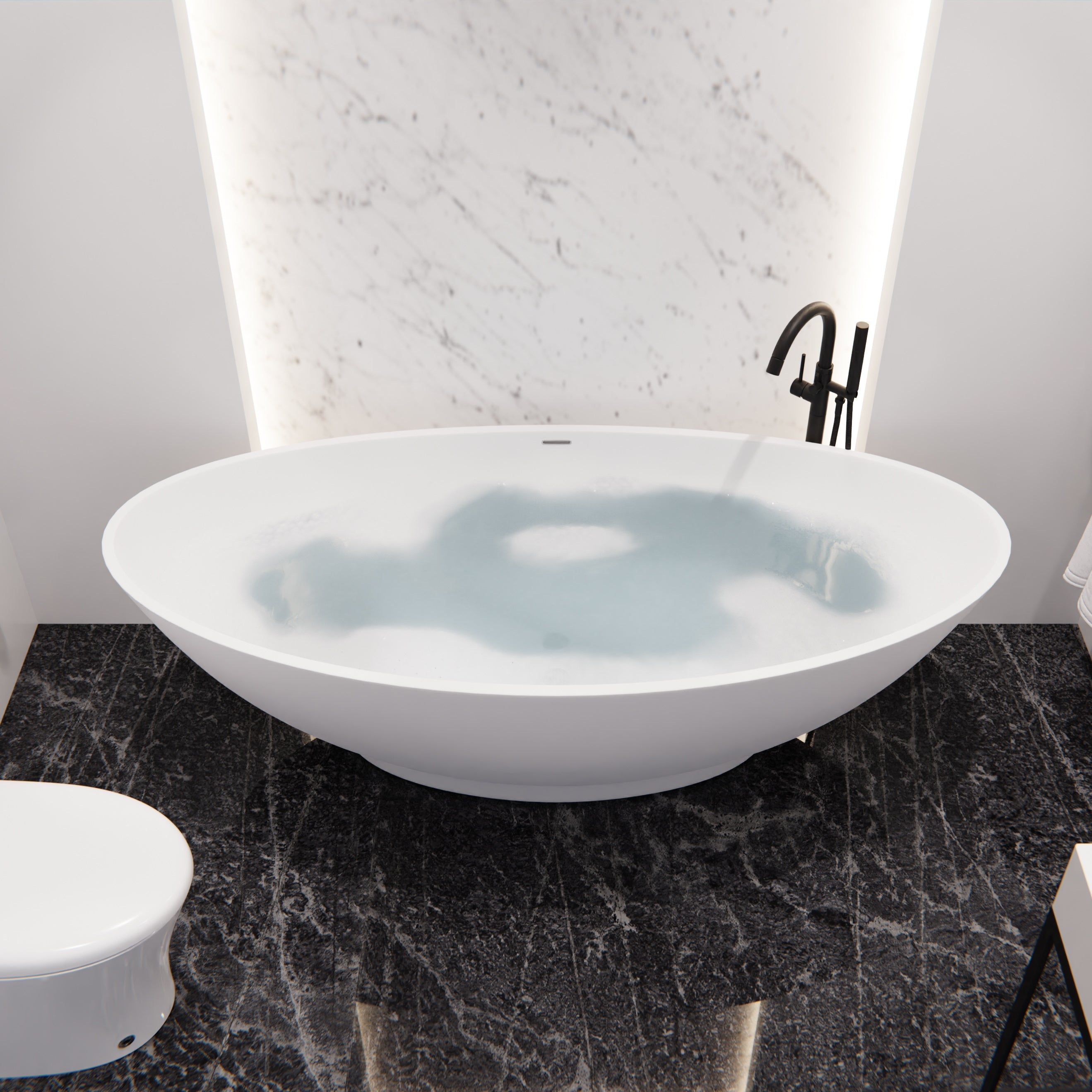 Bring an oasis home with our ANZZI Ala Solid Surface freestanding soaking bathtub. Ergonomically oval designed to cradle the body's form for maximum comfort this tub is styled with a classic and contemporary flair. Relax and drift away while submerged in your personal spa pool.