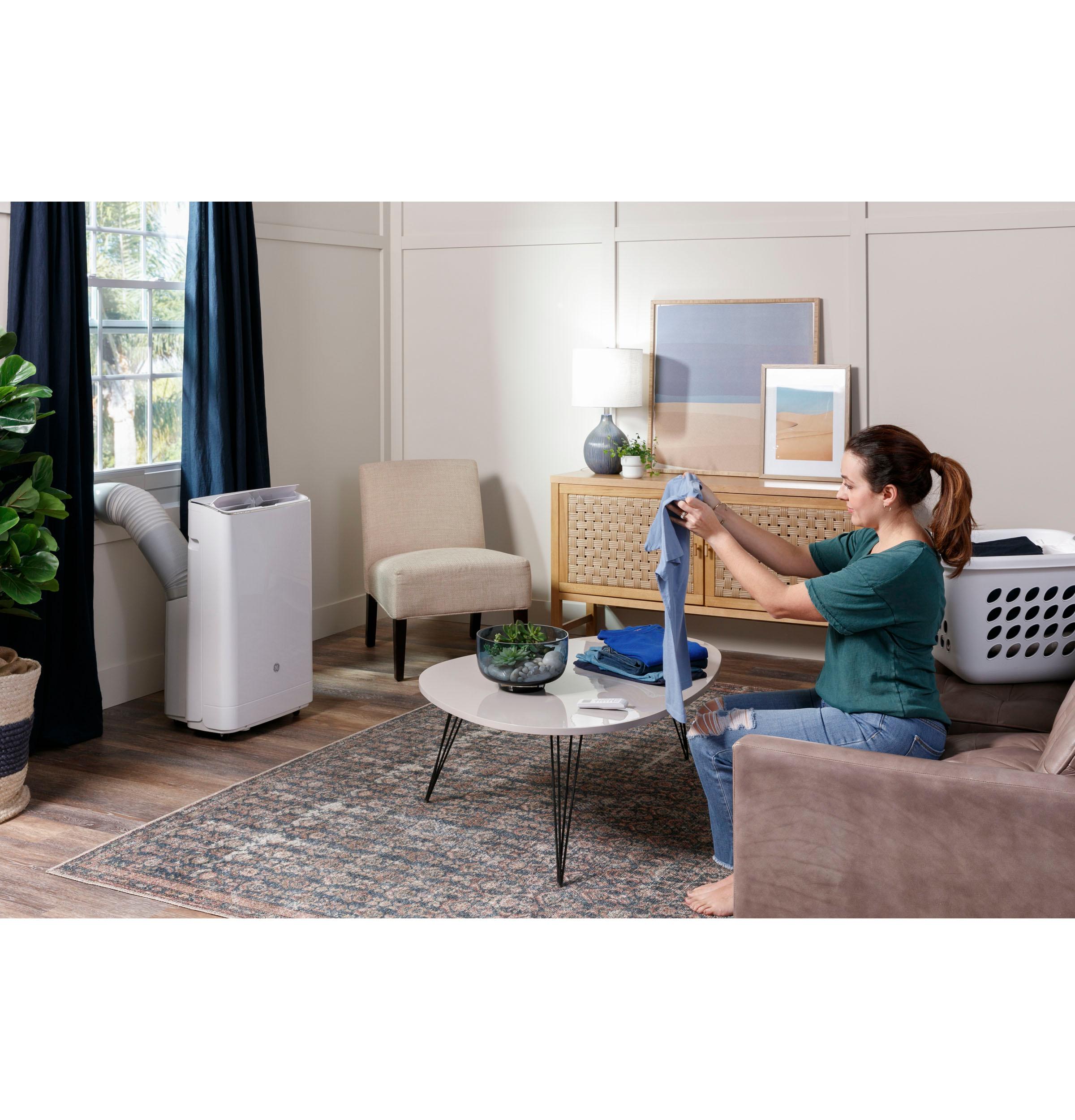 A: This 14,000 BTU (9,950 BTU SACC) portable air conditioner offers both cooling and heating, built-in dehumidification, smart WiFi control, and a remote for year-round comfort in medium rooms up to 550 sq. ft.