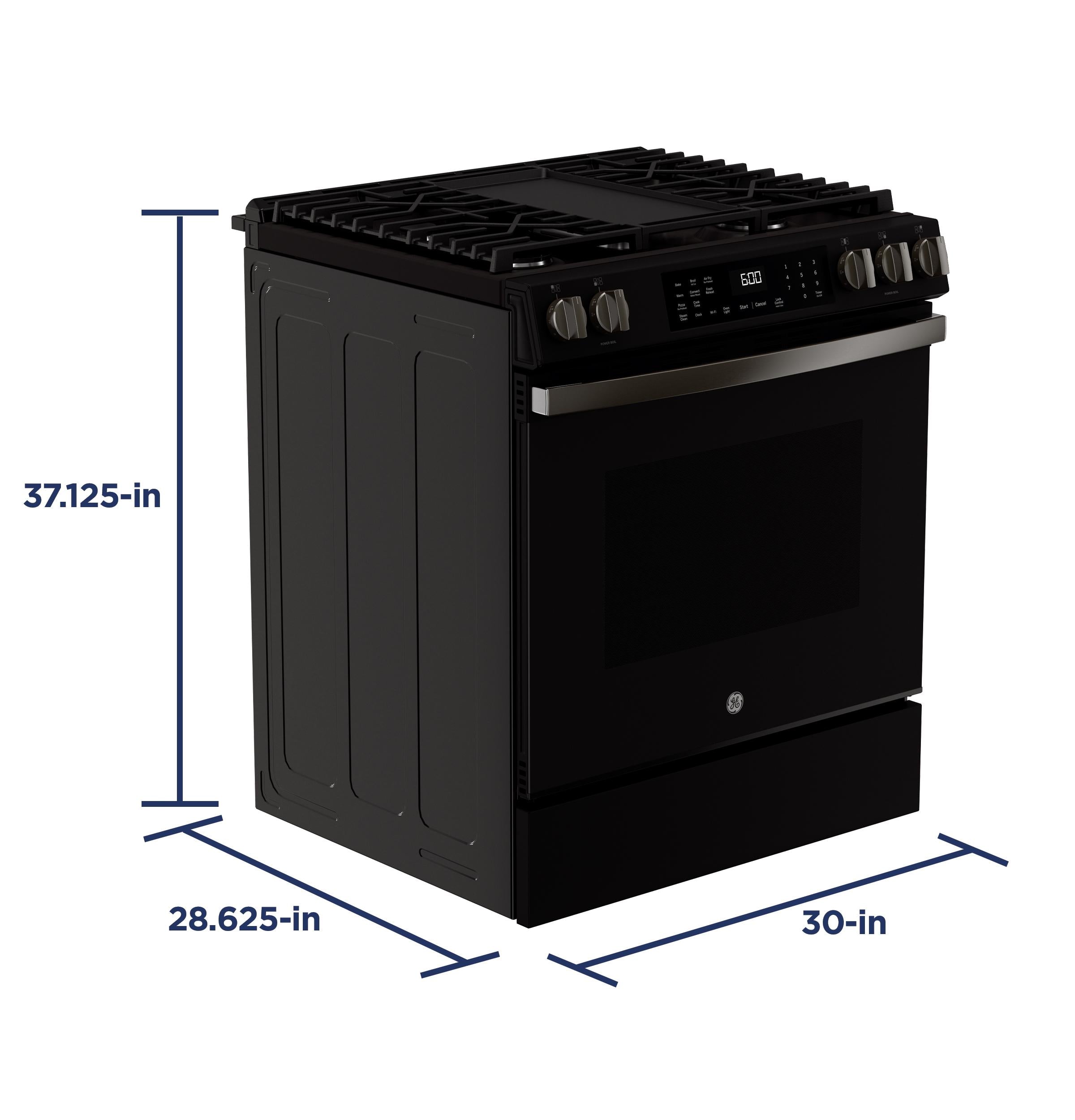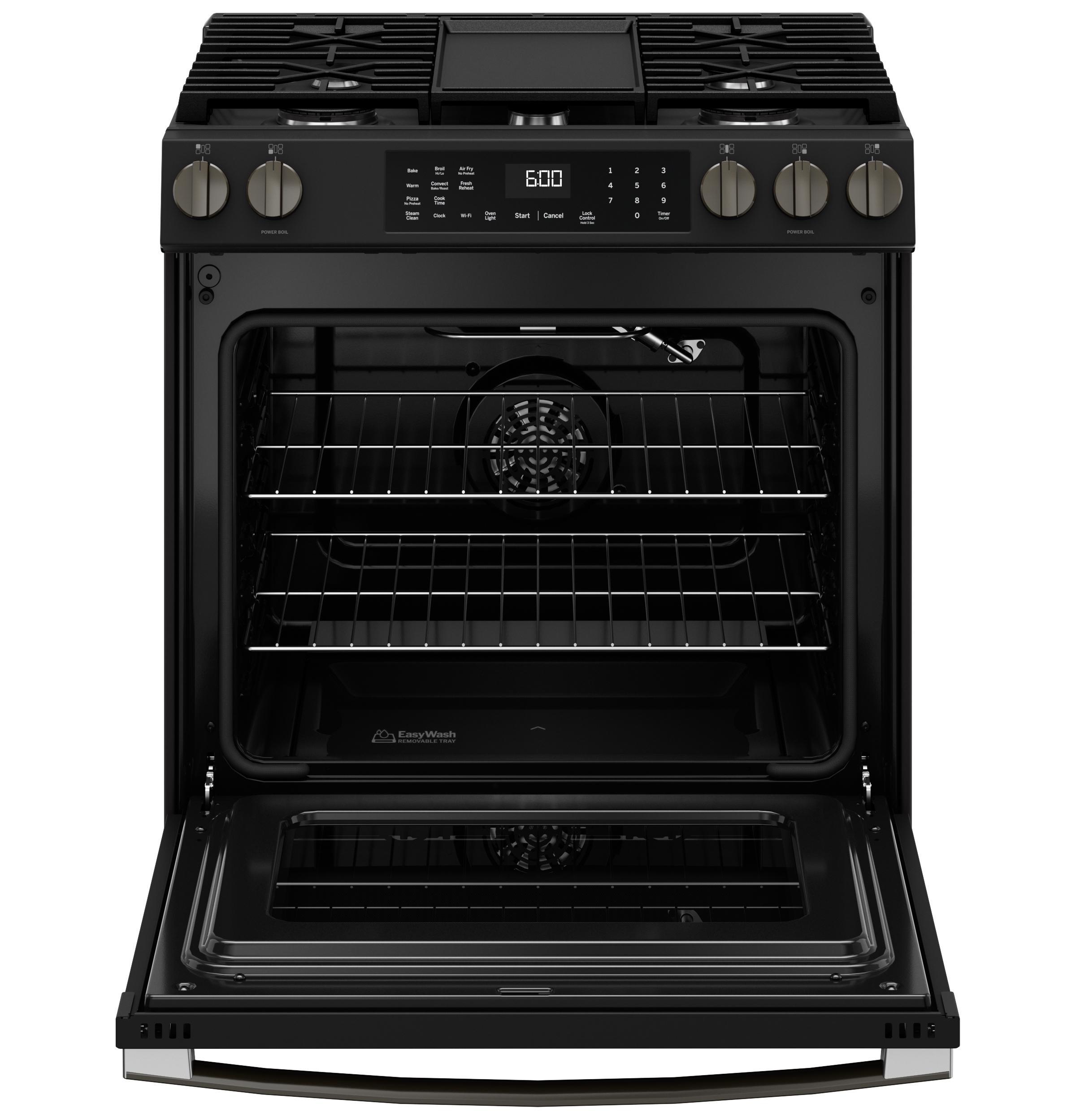 A: This 30" slide-in gas range features Convection Cooking, No Preheat Air Fry, the EasyWash™ Oven Tray, and a powerful 5-burner cooktop for versatile cooking.