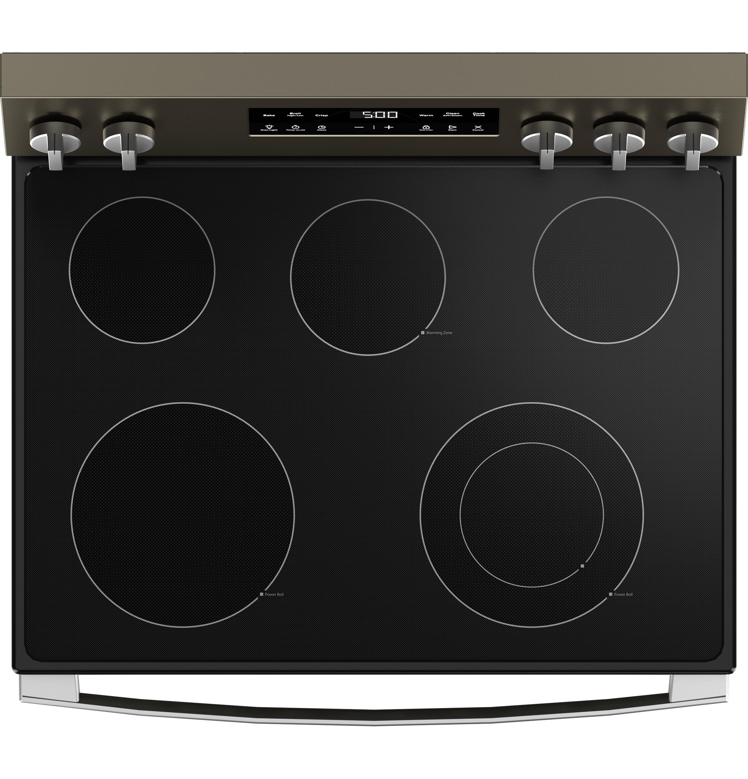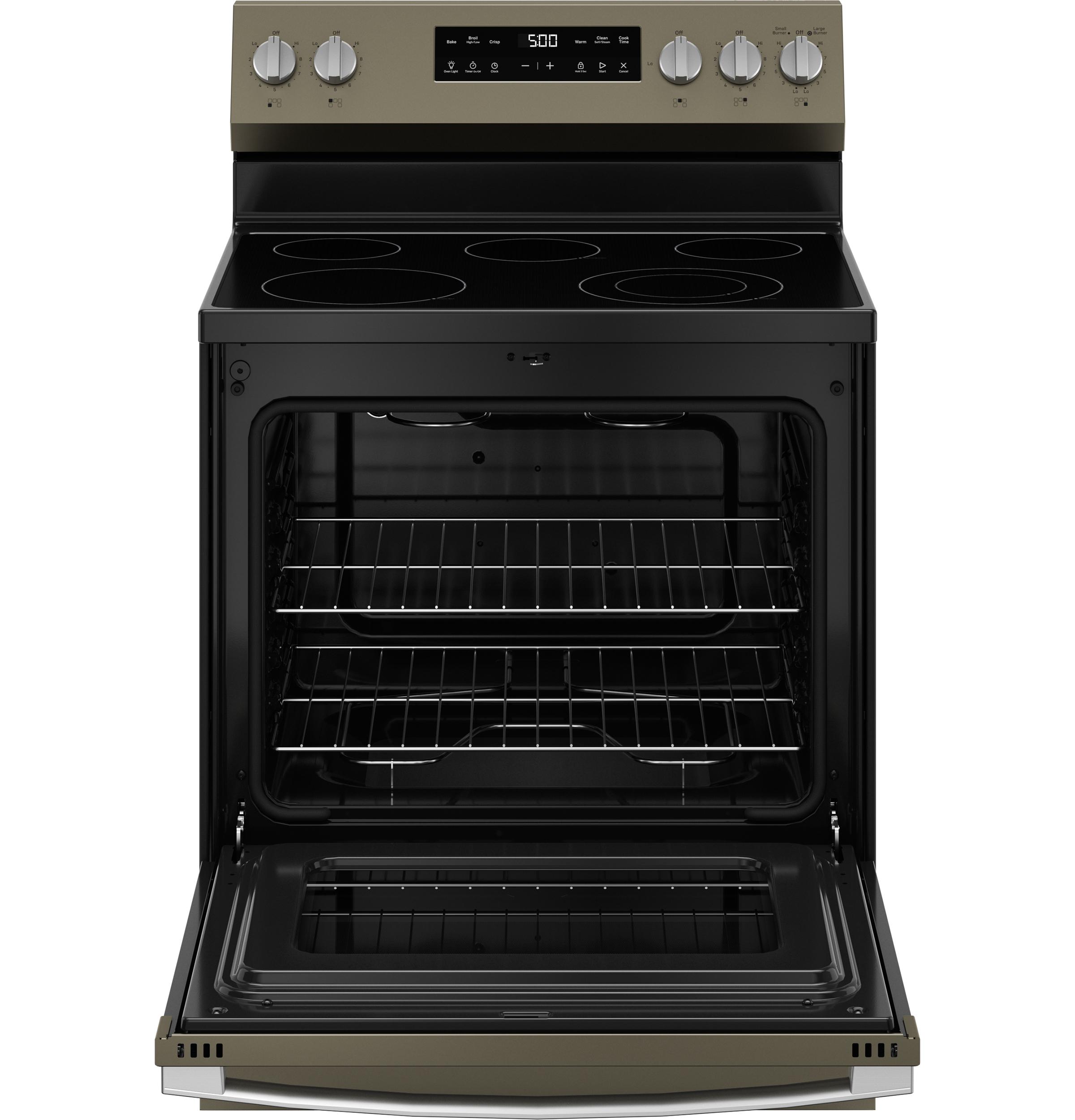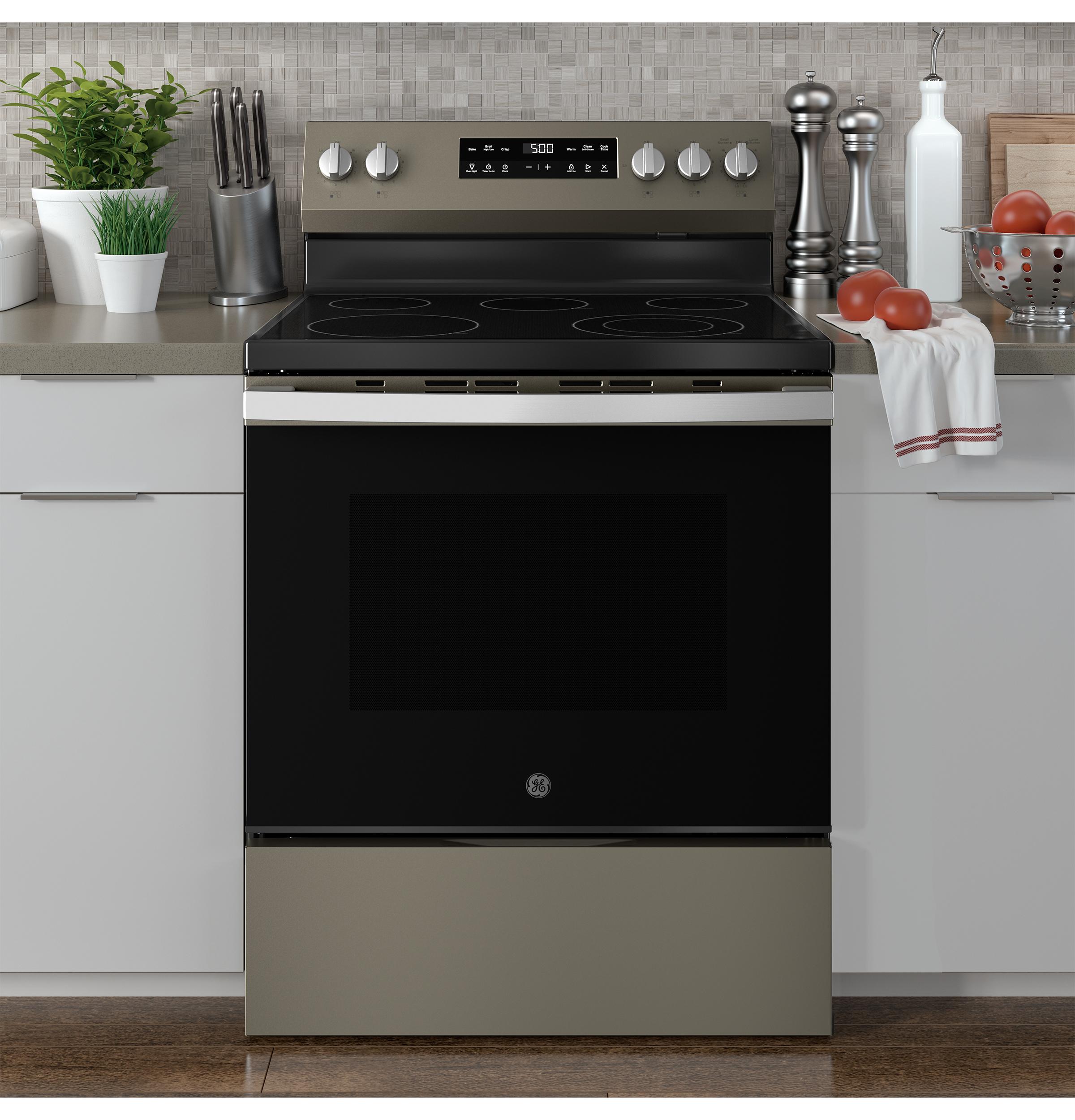 Q: What are the key features of the GE GRF500PVES Free-Standing Electric Range?
