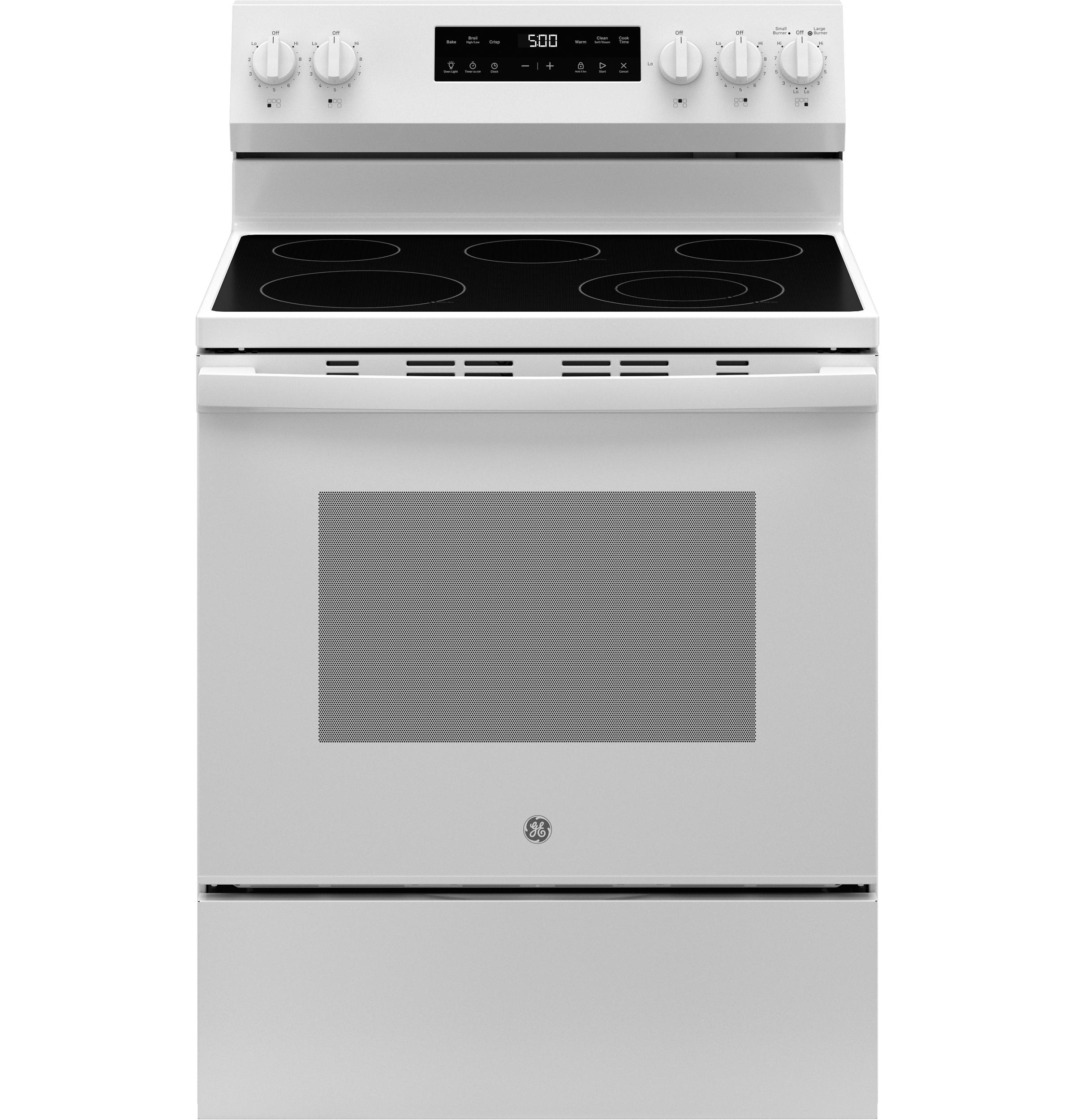 Q: What are the key features of the GE GRF500PVWW Free-Standing Electric Range?