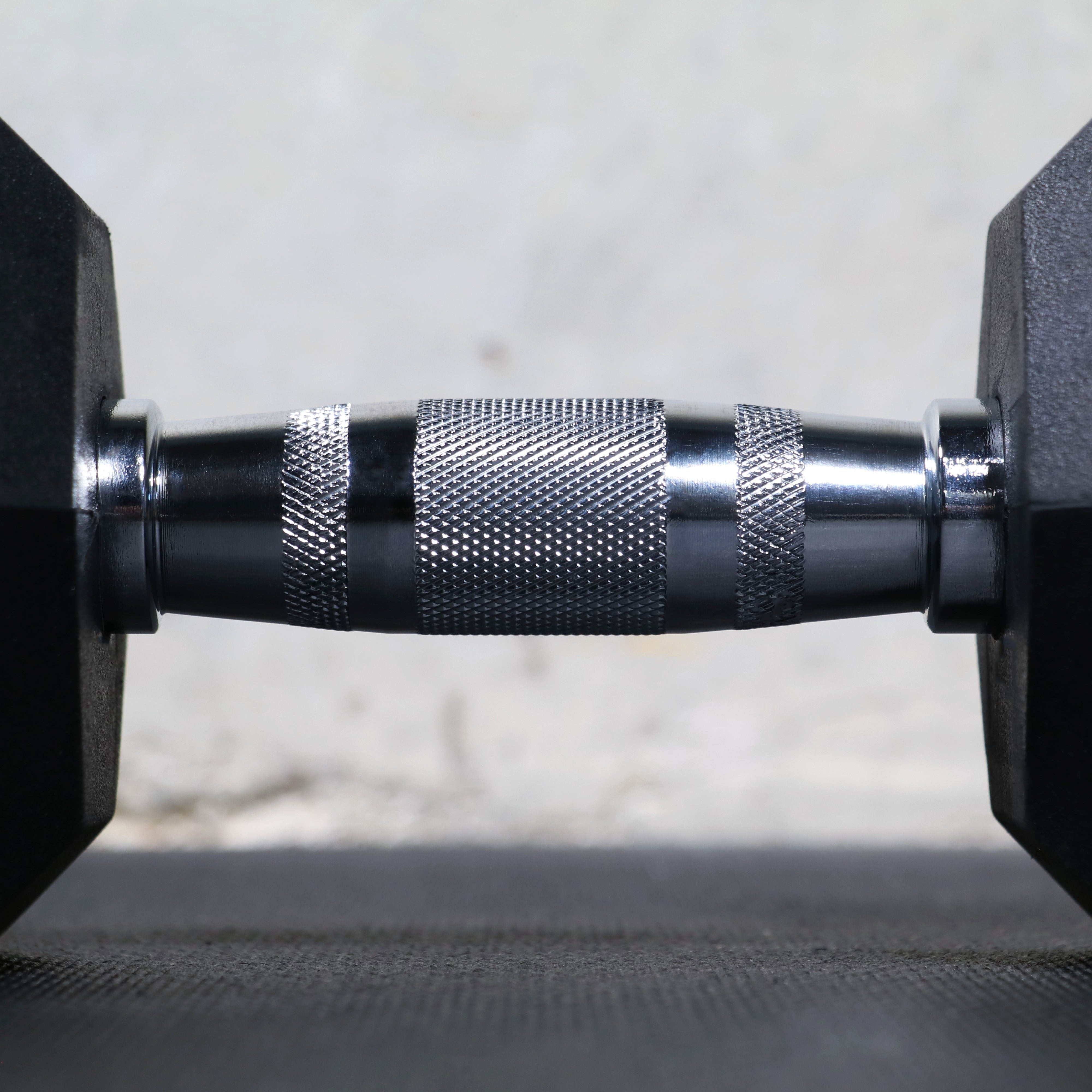 The six-sided rubber encased dumbbells are constructed with durable steel chrome and easy to grip knurled handles. The contoured handles provide a comfortable grip (5-10lb, 28mm)(15-100lb, 34mm). Rubber encase heads will help reduce noise and protect your floors and equipment.
