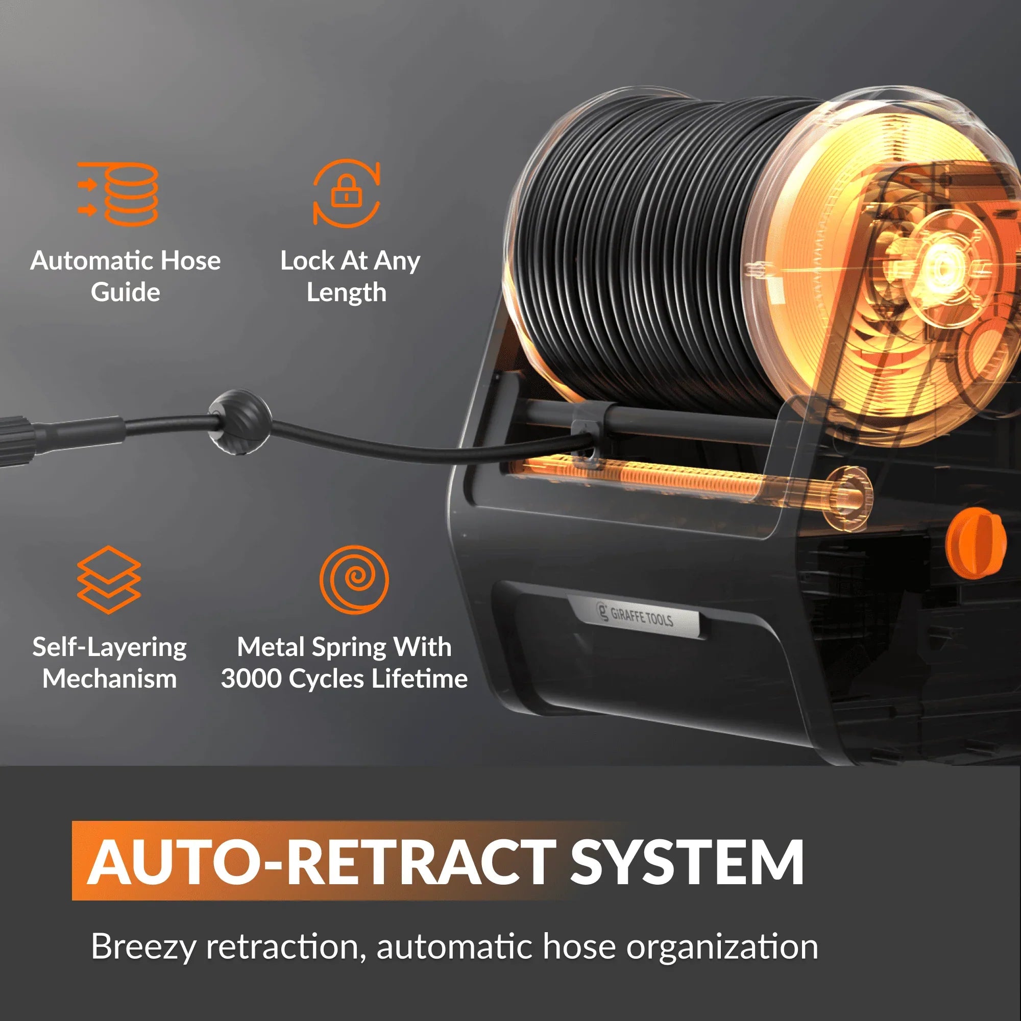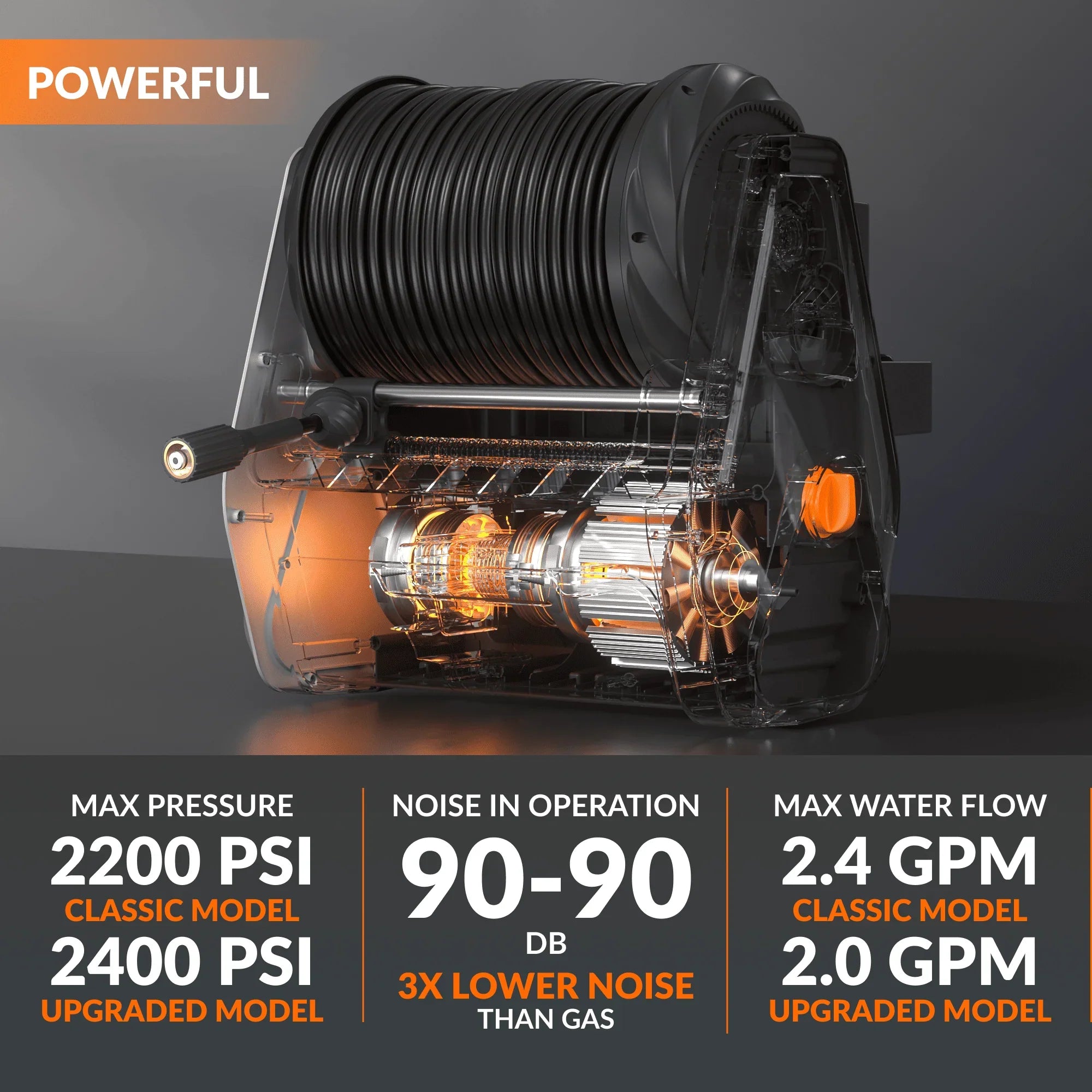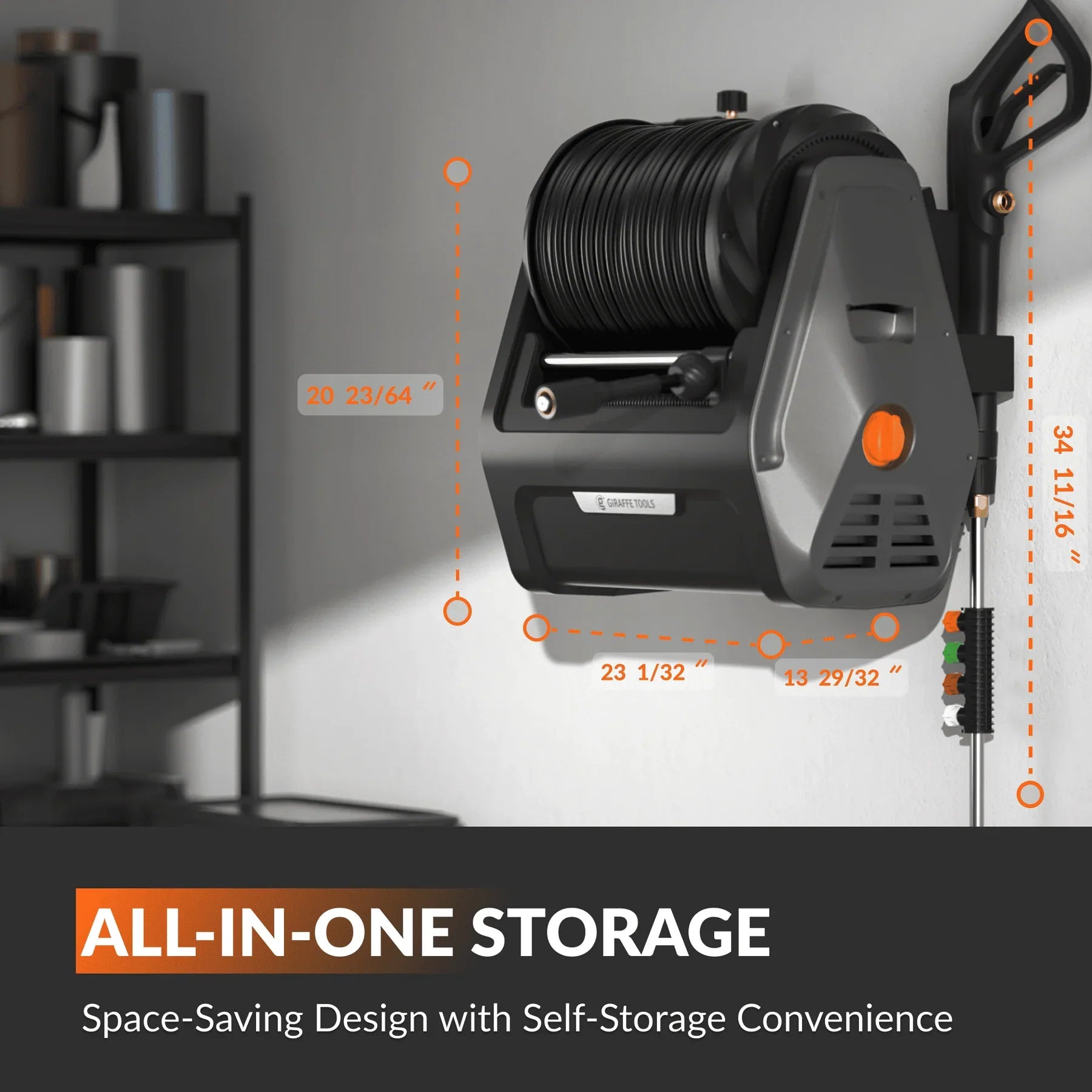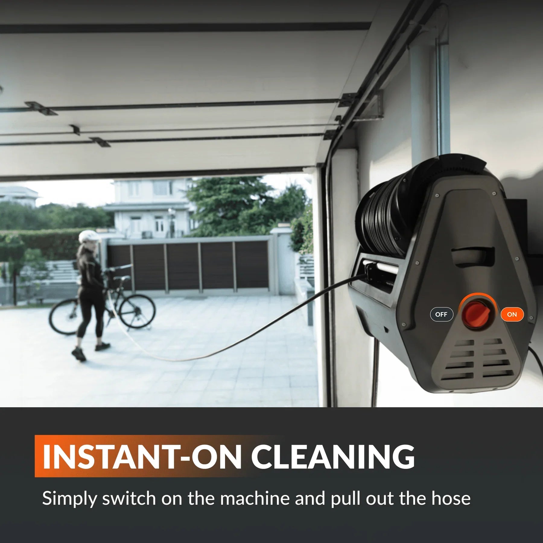 The first generation of an innovative pressure washer with wall-mounted, all-in-one, and ready-to-use features provides one-stop cleaning service, making cleanliness and tidiness effortless. Equipped with a 100 ft. high-pressure hose, it makes anywhere easy to clean. Total Stop System automatically shuts off the pump when the trigger is not engaged, saving energy and prolonging the pump's life. The wall-mounted design and self-storage feature keep your space cozy and neat.