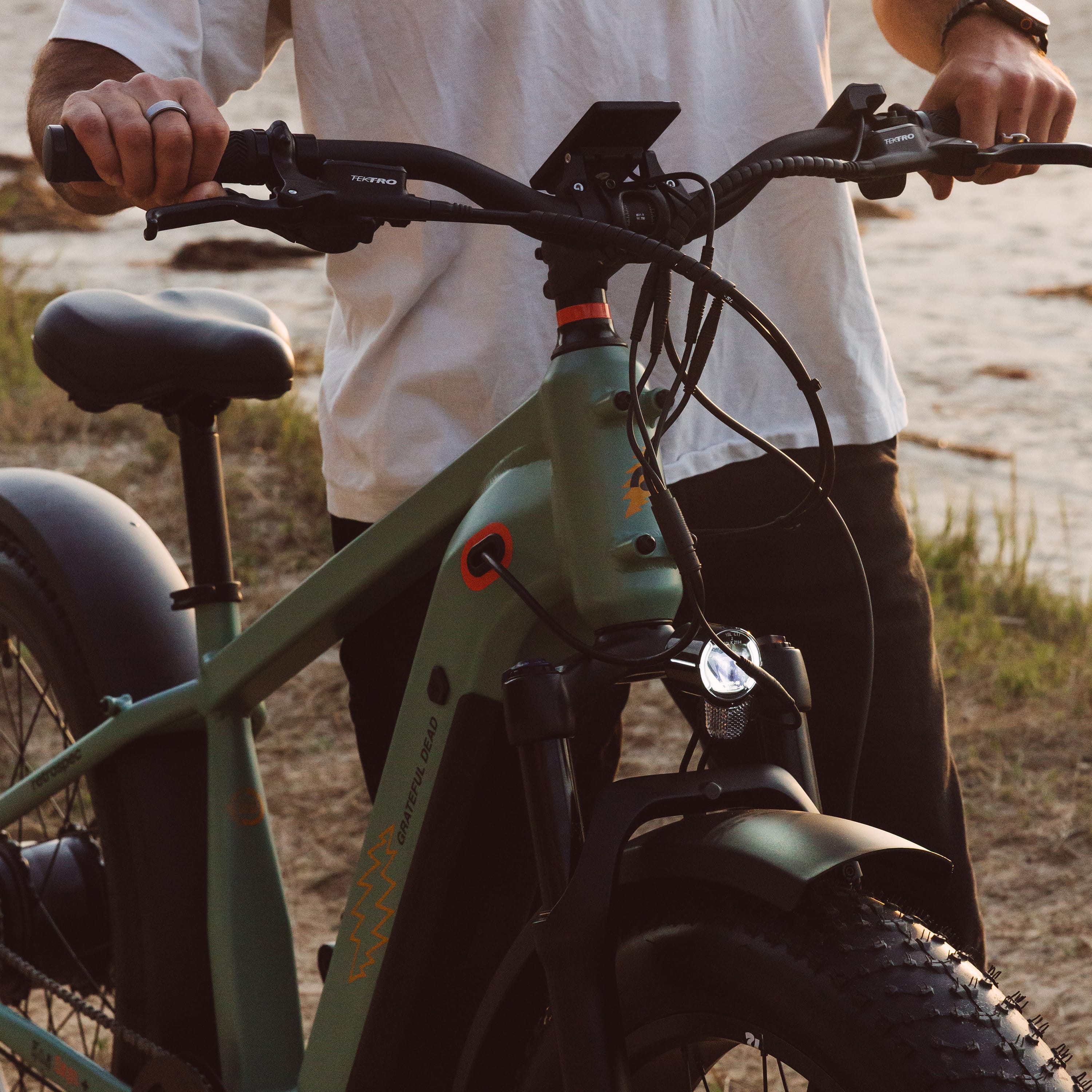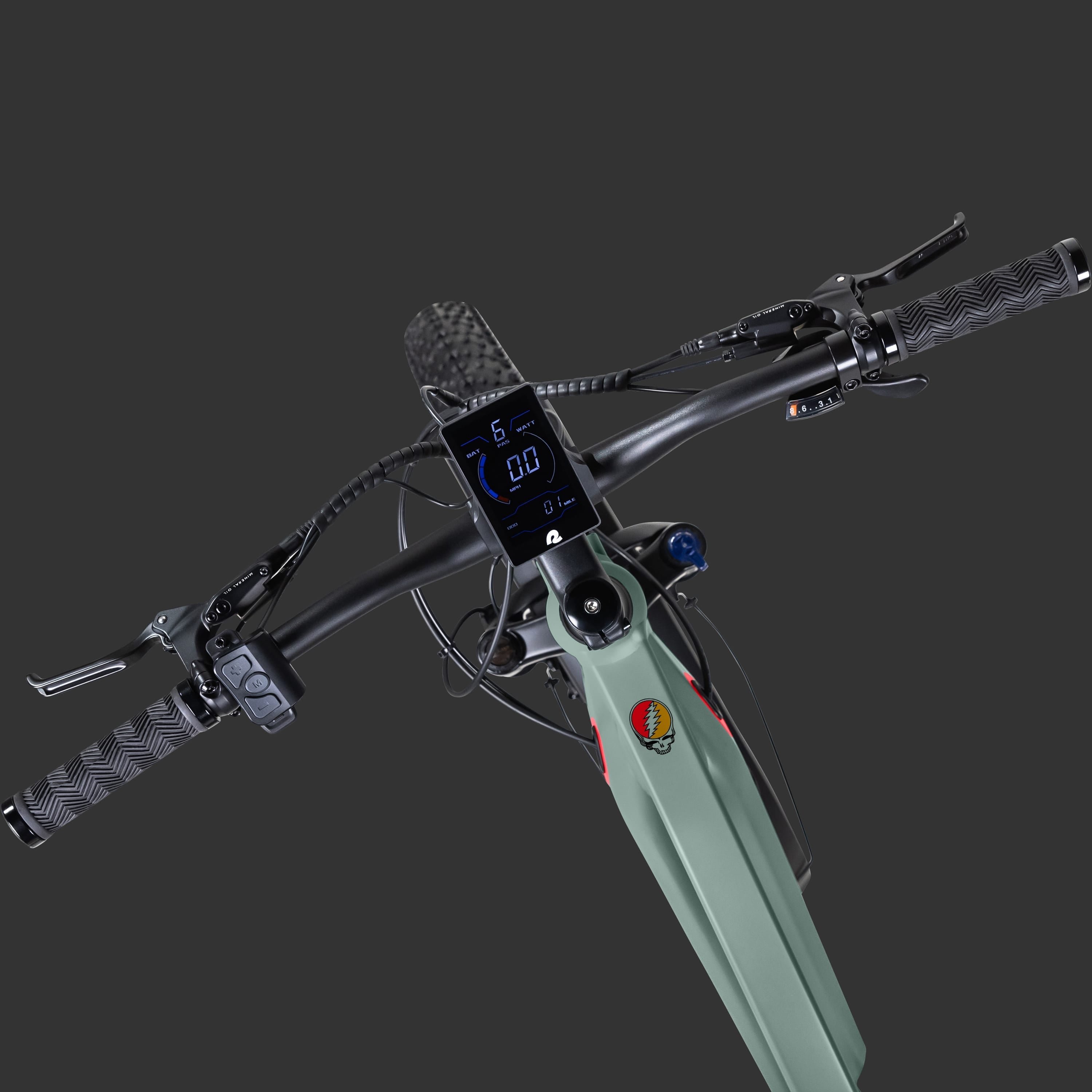 Reach new heights with a fat tire ebike that truly does it all. Koa Rev+ 2 offers a comfortable ride on any terrain – its puncture-protected fat tires and 80mm front suspension fork can handle gravel, dirt, snow, and just about anything else that lies in the path ahead. Its limited-edition design features some of the Grateful Dead’s most iconic artwork, including the 13-point lightning bolt and Steal Your Face logo, so you’ll feel the band’s adventurous spirit with you on every ride. This ebike is modern and powerful, yet every feature is intended to be user-friendly for riders of any skill level. The torque sensor offers smooth, intuitive pedal assistance, and you can unlock your adventure’s full potential with a Class 3 option that offers assisted speeds up to 28mph. Combine that with a modern frame geometry that allows for a more upright riding position, and you get a smooth, comfortable ride with the power to explore absolutely everywhere. Enjoy uninhibited exploration with an improved range of up to 72 miles per charge and integrated front & rear lights that can guide your way home when the sun sets.