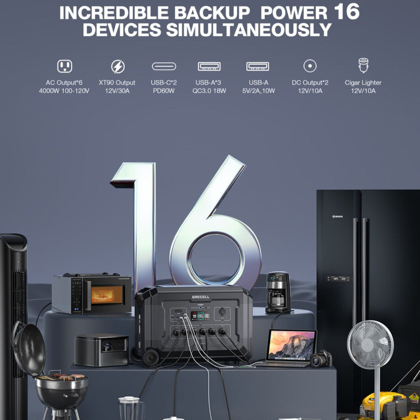The GRECELL 4000W Portable Power Station features a 5040Wh LiFePO4 battery, 6 AC outlets (7000W peak), and 16 total outlets to support most appliances. It charges fully in 1.5 hours and can expand to 10.08kWh with an extra battery. Equipped with <20ms EPS for reliable operation during power outages, it is ideal for home emergencies, RV camping, and off-grid activities, offering over 4000 charge cycles and a 10-year lifespan.