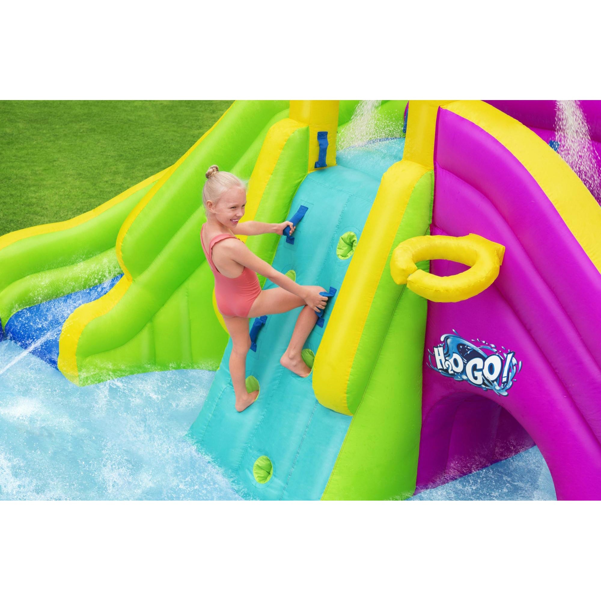 - Features a climbing wall that leads to an extra-wide platform with fun slides and water sprayers