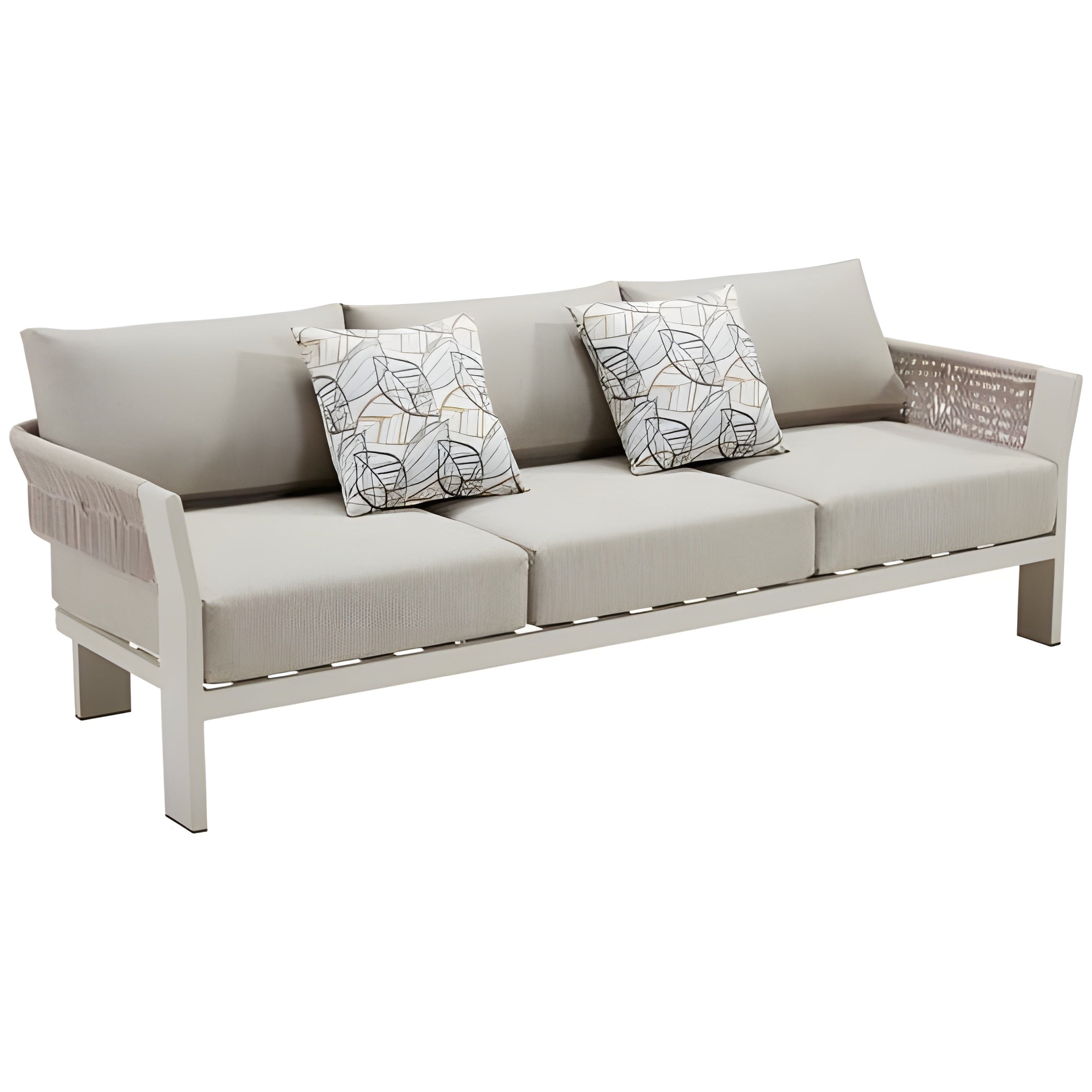 A: The sofa features durable, weather-resistant fabric, a sturdy aluminum frame, and plush cushions for maximum comfort. It is designed to withstand outdoor conditions while providing elegant seating.
