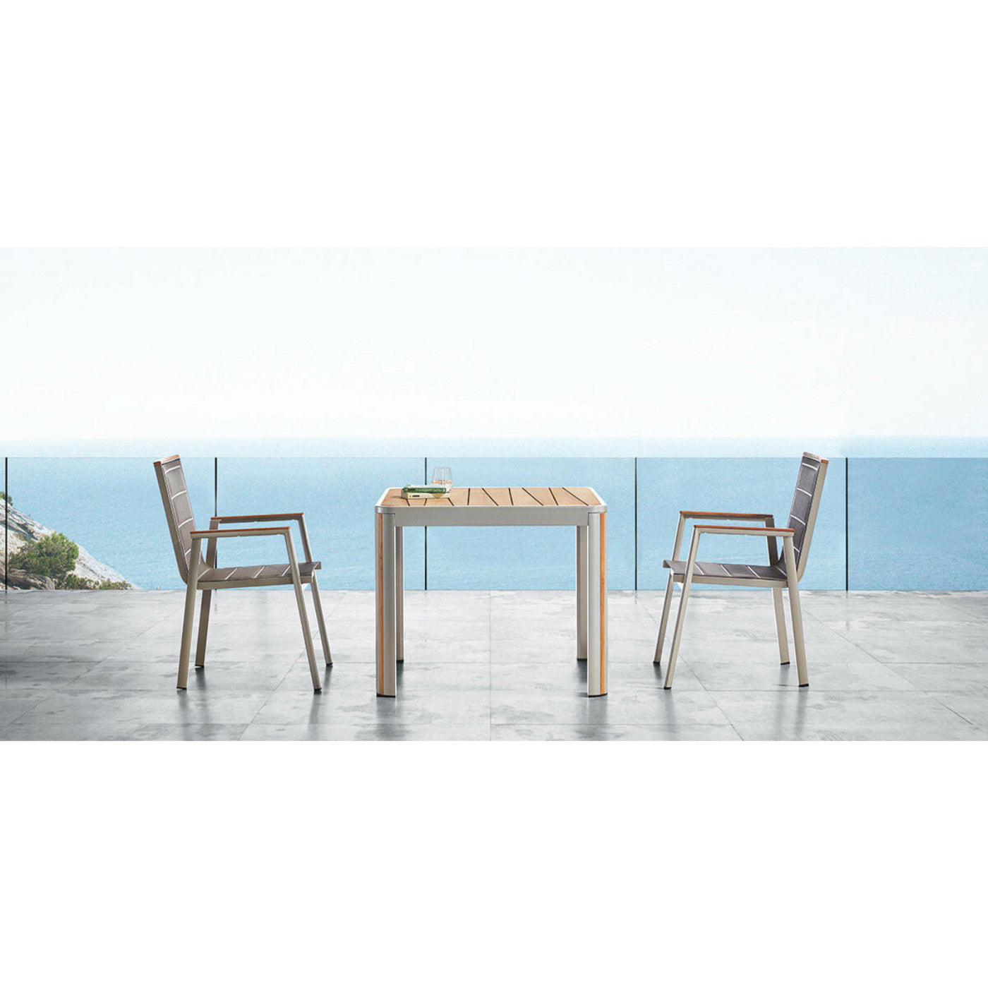 The HiGold Geneva collection dining arm chair offers simple elegance. By combining a padded sling, aluminum frame, and teak accents, this collection is durable, stylish, and accessible. Geneva’s sleek, minimalist designs feature stunning attention to detail with teak inlays in table legs, and contoured teak arm caps. Geneva tables are truly innovative, featuring unique patterns.