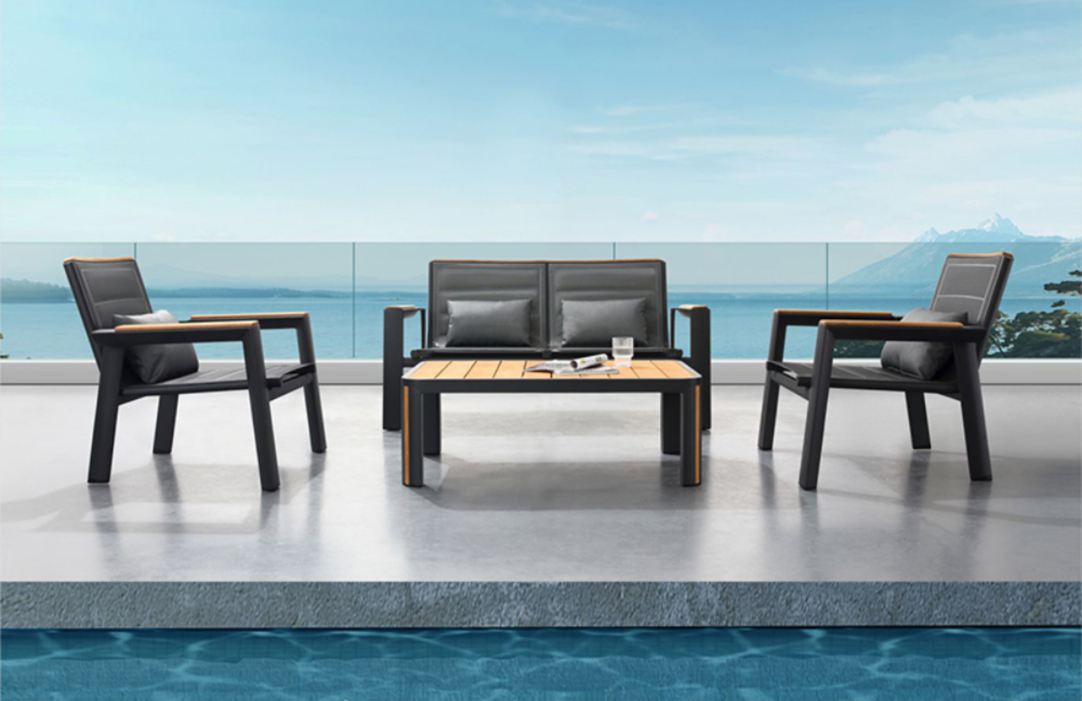 A: A modern and elegant outdoor seating set featuring a loveseat, two lounge chairs, a coffee table, and a side table, perfect for stylish outdoor relaxation.