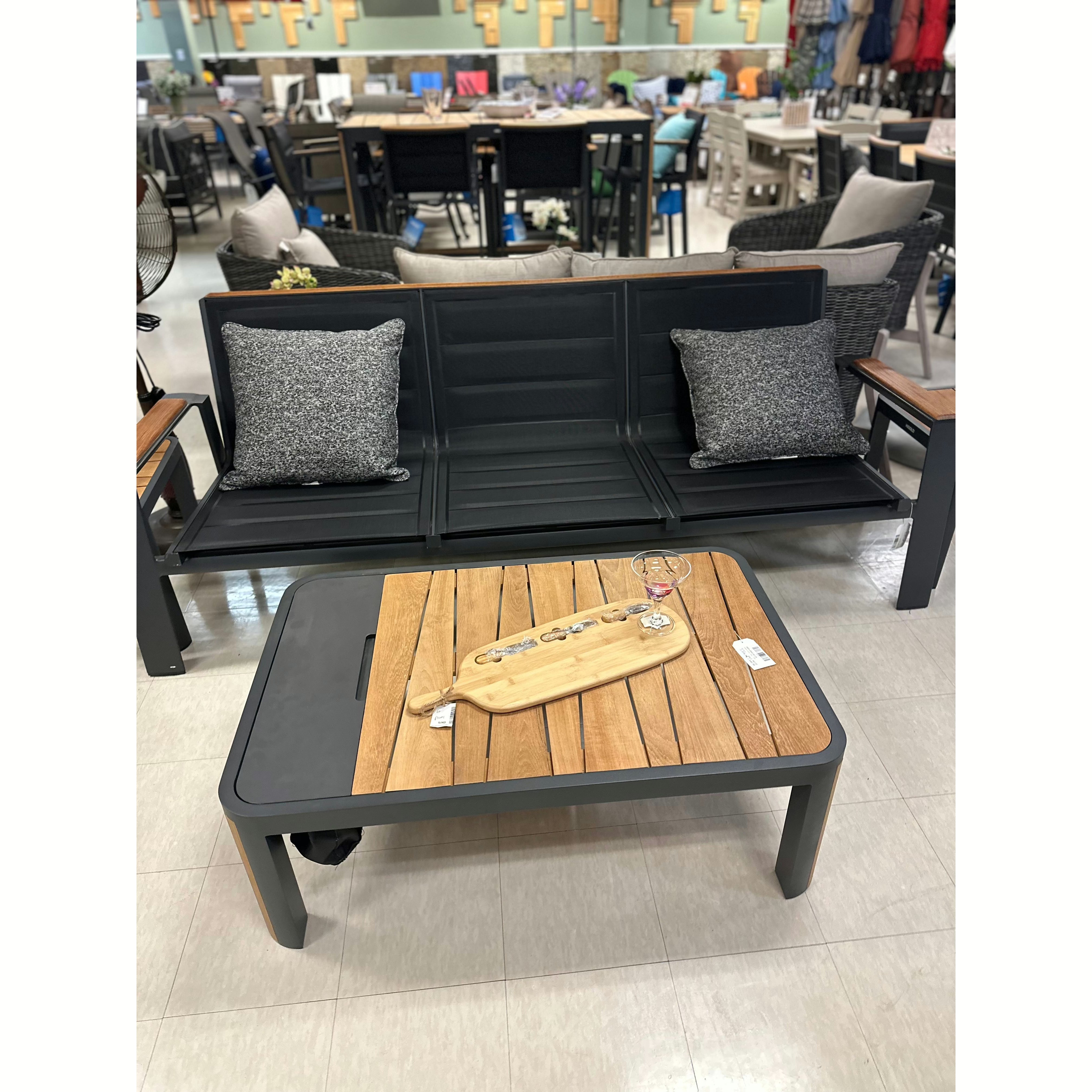 The HiGold Geneva collection outdoor sofa Nero offers simple elegance. By combining a padded sling, aluminum frame, and teak accents, this collection is durable, stylish, and accessible. Geneva’s sleek, minimalist designs feature stunning attention to detail with teak inlays in table legs, and contoured teak arm caps. Geneva tables are truly innovative, featuring unique patterns.