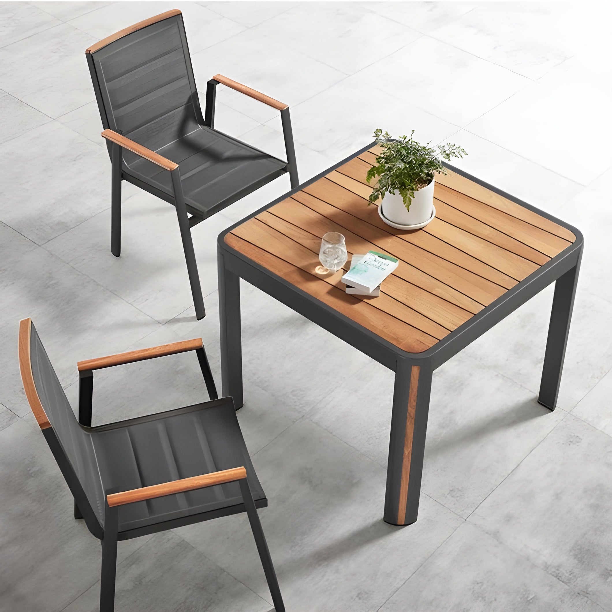 The HiGold Geneva square dining set offers simple elegance. By combining a padded sling, aluminum frame, and teak accents, this dining set is durable, stylish, and accessible. Geneva’s sleek, minimalist designs feature stunning attention to detail with teak inlays in table legs, and contoured teak arm caps. Geneva tables are truly innovative, featuring unique patterns.