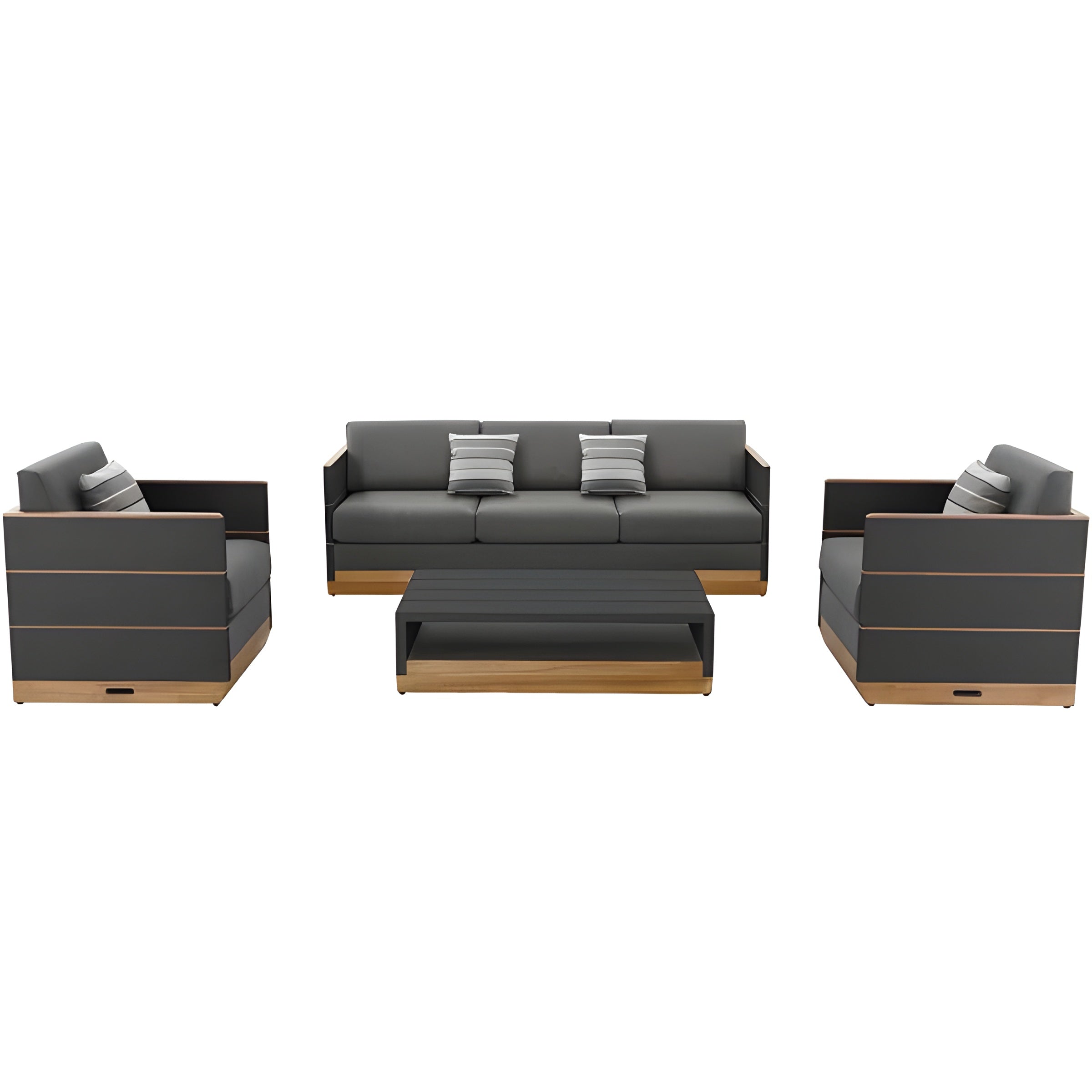 The HiGold Nutt collection seating set breaks down conventional design thinking as it blends aluminum and teak construction with stunning style. Return to the basics of modular design with its combination of an aluminum base and slats, capped with a teak accent. Enjoy the natural beauty of teak with the convenience of aluminum. Sure to be the focal point of any space, the Nutt collection offers contemporary styling with durable materials built to last.