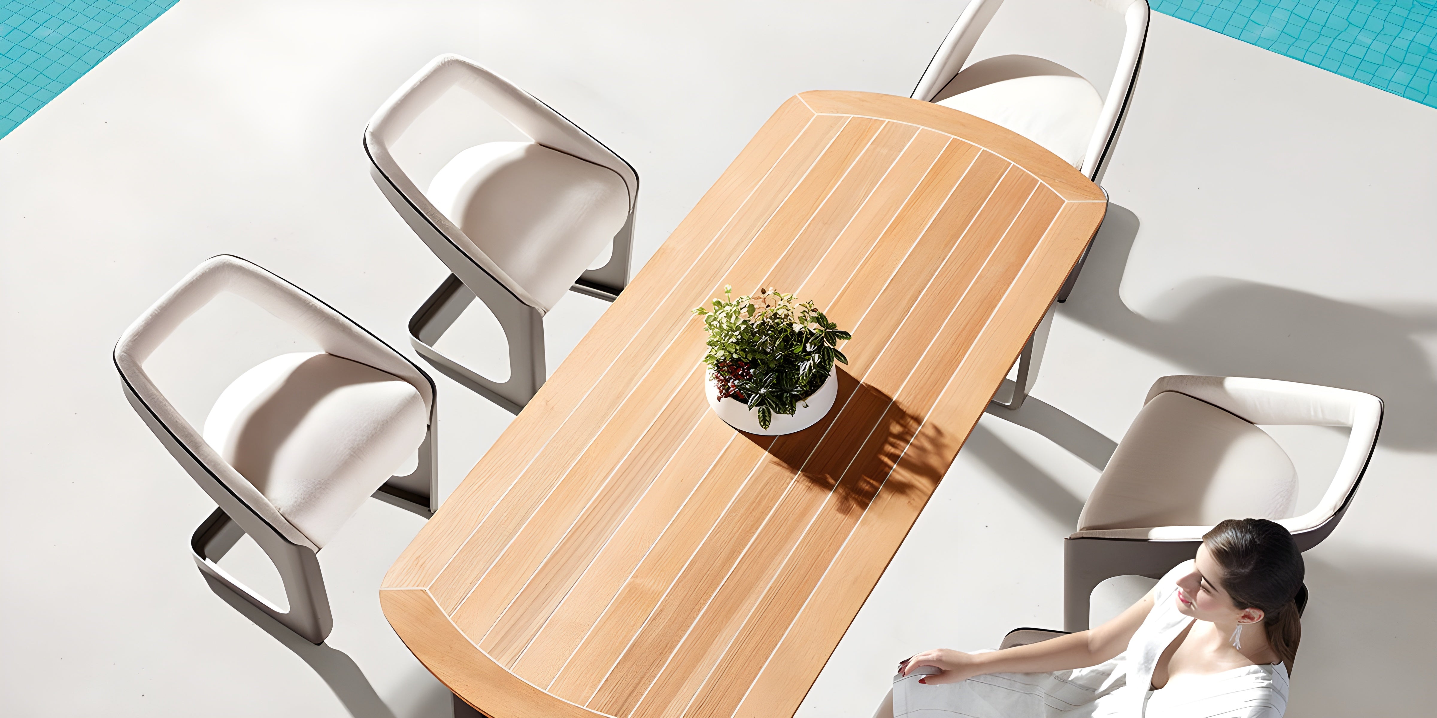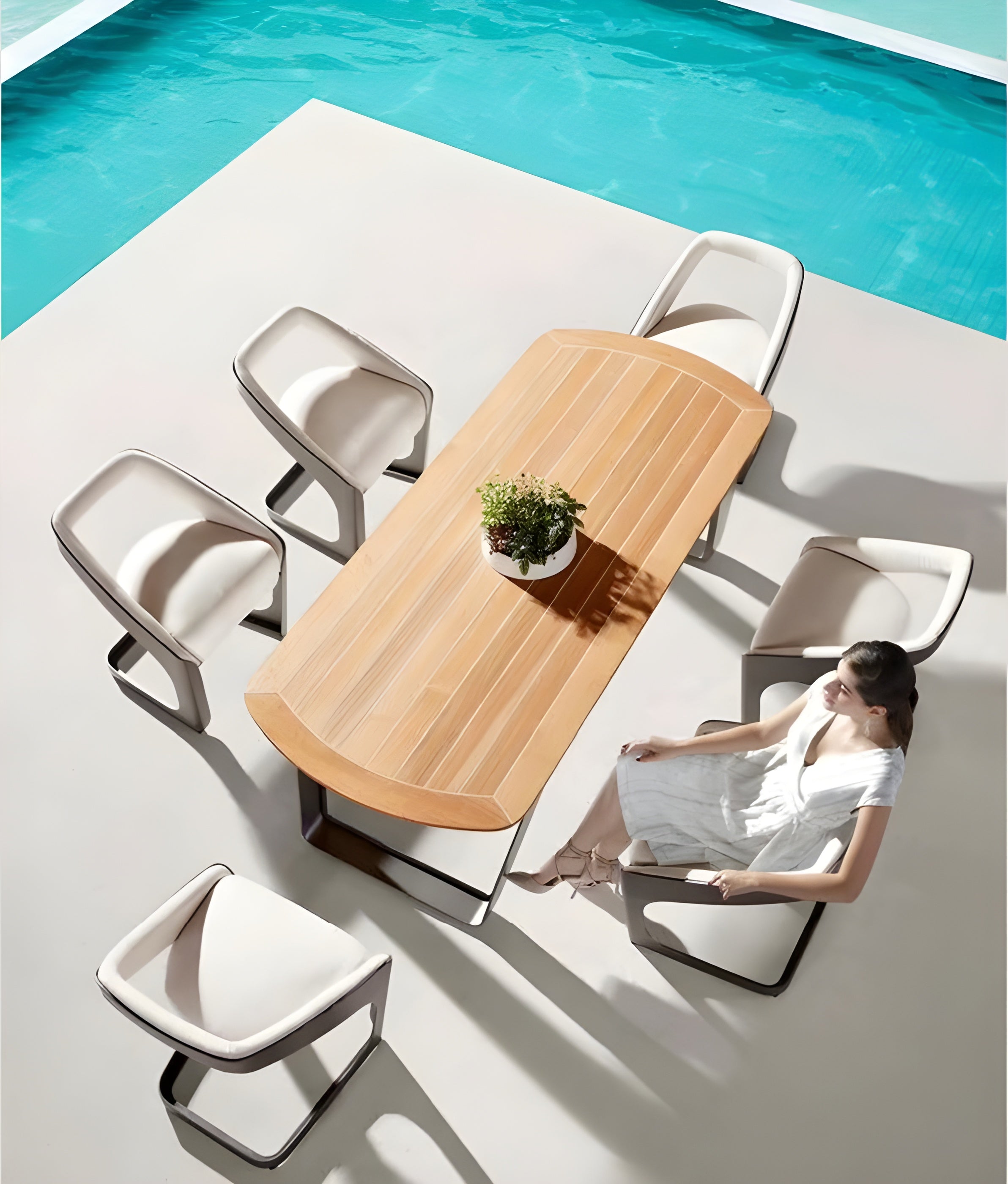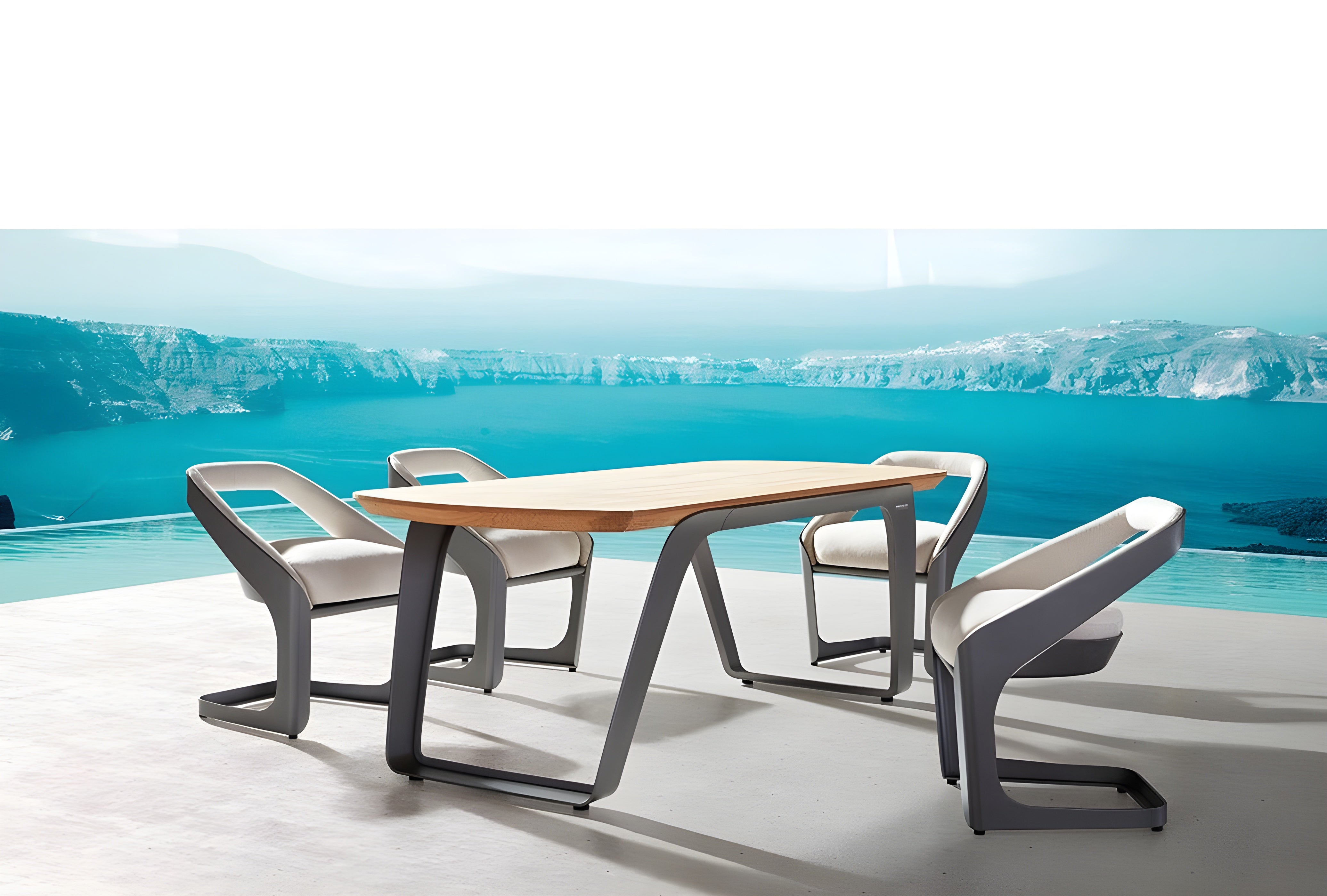 The Higold Onda dining set is designed by Pininfarina, the illustrious automotive design firm, and is the pinnacle of fine outdoor living. Pininfarina took inspiration from the dynamic elegance and purity of ocean waves. The solid, one-piece construction evokes the infinite rhythm of the tides, and the curvature of the frame mimics waves as they roll towards shore. No expense has been spared in construction – thick aluminum frames, beautiful teak, and premium cushions are supremely durable.