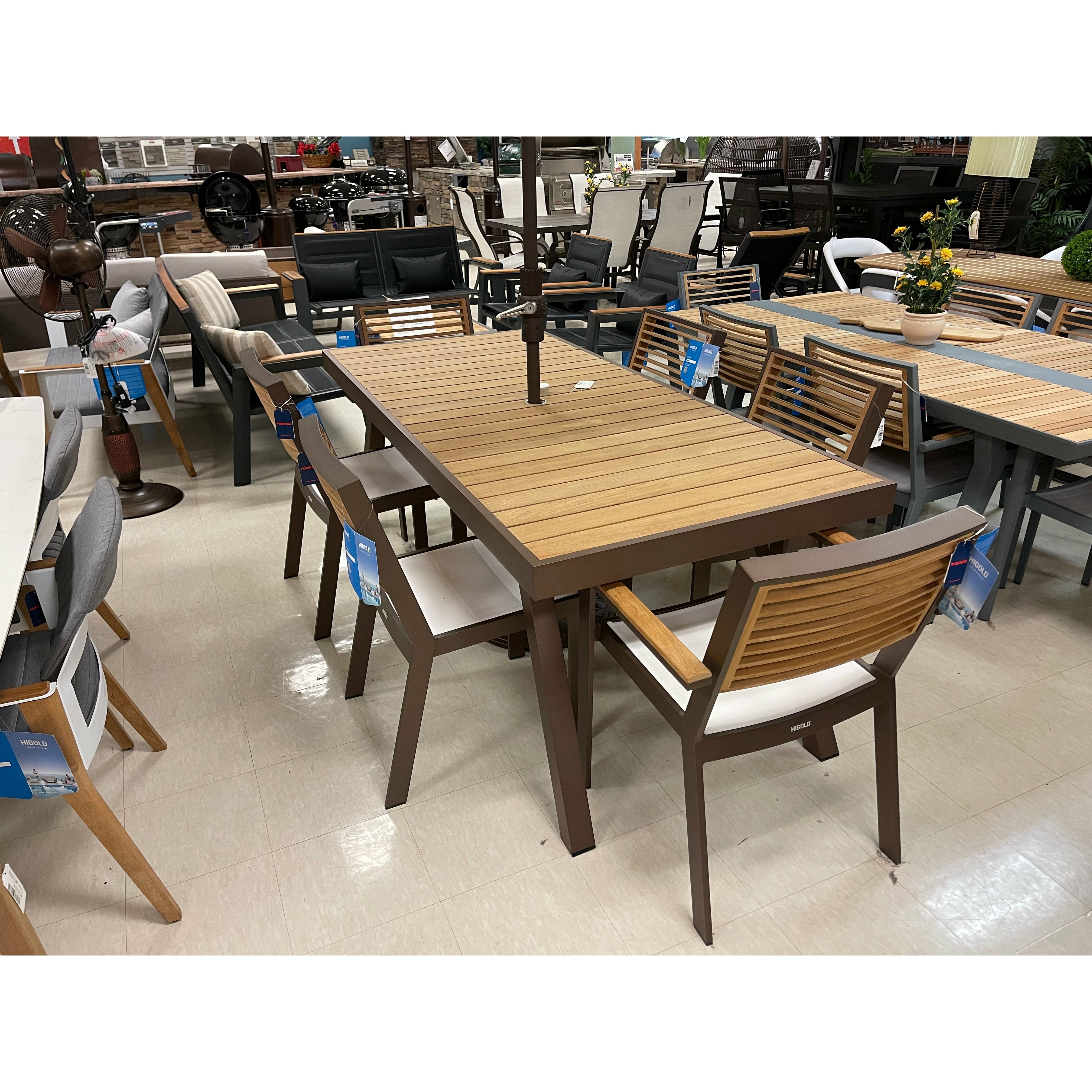 The Higold York collection rectangular dining table features clean lines and a smooth combination of teak and aluminum. Seating pieces feature convenient flip-up side tables, maximizing space and efficiency. York’s cutting edge style doesn’t sacrifice comfort – premium foam cushions ensure a soft seat perfect for hours of lounging.