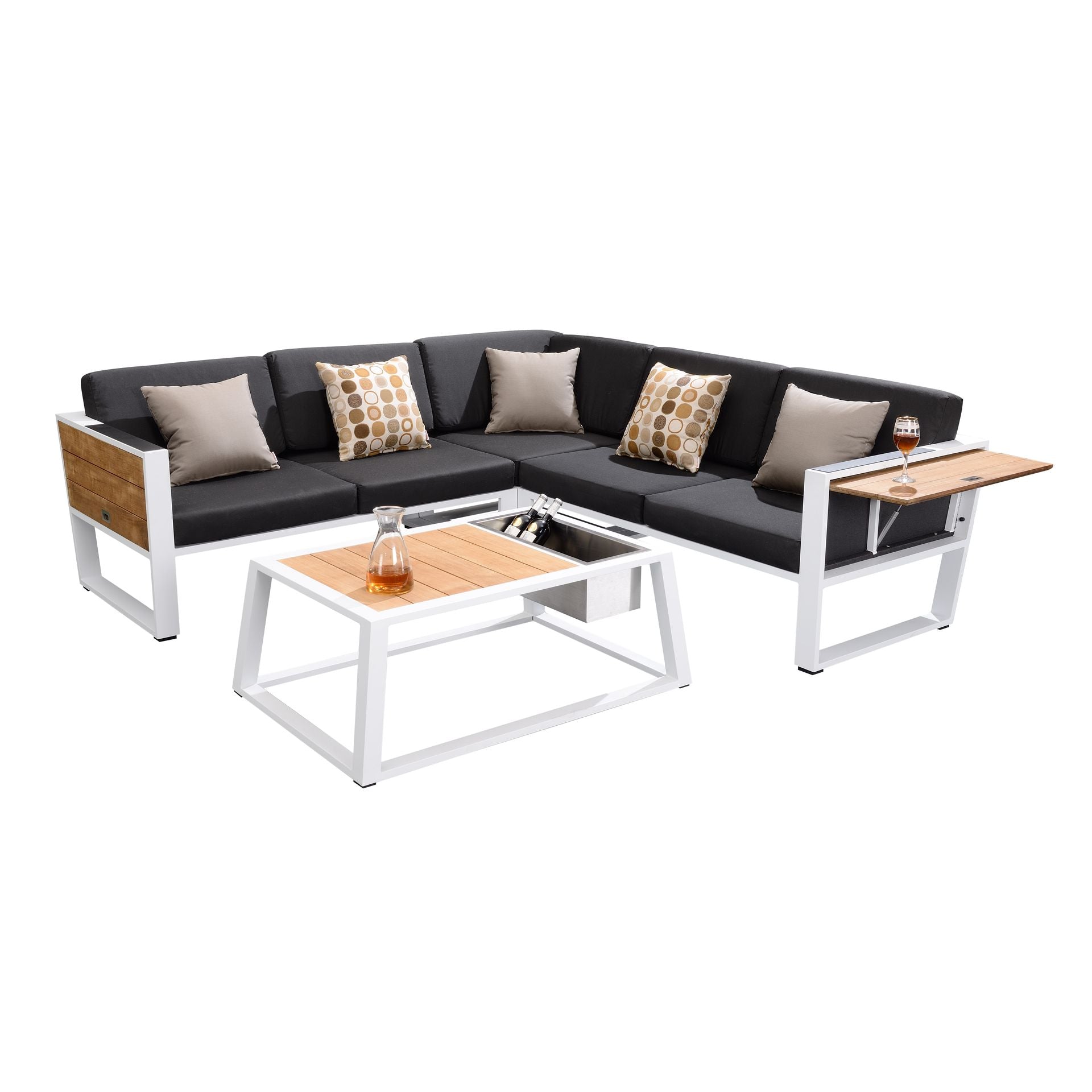 HiGold York collection right sectional features clean lines and a smooth combination of teak and aluminum. Seating pieces feature convenient flip-up side tables, maximizing space and efficiency. York’s cutting edge style doesn’t sacrifice comfort – premium foam cushions ensure a soft seat perfect for hours of lounging.